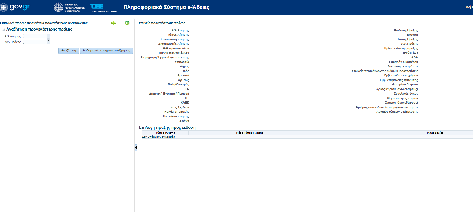 Καλημέρα. Θέλω να κάνω τη διαδικασία θεώρησης έντυπων αδειών για να προχωρήσω στην έκδοση βεβαίωσης σύνδεσης με τα δίκτυα. Πρόκειται για άδειες του 1962, 1973, 1976 και 1979, ενώ έχει γίνει και τακτοποίηση με τον 4178. Προσπαθώντας να κάνω υποβολή της αίτησης μου βγάζει το εξής μήνυμα: -"Πρέπει να καταχωρηθεί τουλάχιστον μια Προγενέστερη Διοικητική Πράξη - Έντυπη (με ορθή Ημ. Λήξης)". Γνωρίζει κάποιος τι πρέπει να κάνω; Σας ευχαριστώ! -