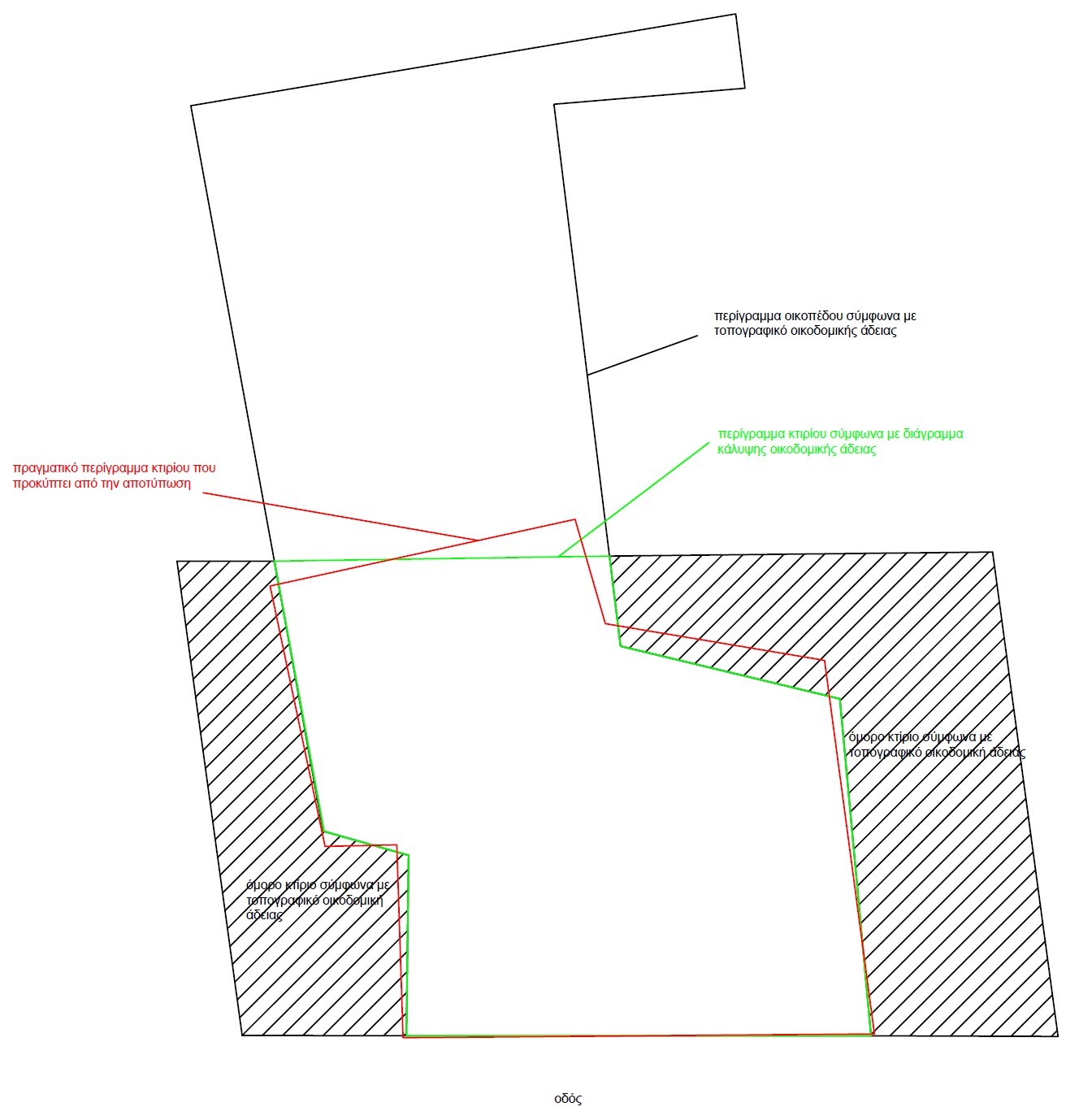 Καλησπέρα συνάδελφοι. Για διώροφο κτίριο με οικοδομική άδεια του 1989, το τοπογραφικό της οικοδομικής άδειας παρουσιάζει ένα περίγραμμα του οικοπέδου. Σύμφωνα με το τοπογραφικό αυτό, και στα δύο πλάγια όρια του οικοπέδου, είναι κατασκευασμένα και εφάπτονται όμορα γειτονικά κτίρια. Σύμφωνα με το διάγραμμα κάλυψης της οικοδομικής άδειας, ο πελάτης μου κατασκεύασε το διώροφο κτίριο του σε επαφή με τα δύο πλάγια όρια του οικοπέδου του και κατά συνέπεια σε επαφή με τα δύο όμορα γειτονικά προϋφιστάμενα κτίρια. Ηρθε σε εμένα για τακτοποίηση της ιδιοκτησίας του. Έκανα αποτύπωση και συμπέρανα τα παρακάτω: 1) Το κτίριο εφάπτεται όντως στη μία πλευρά του με όμορο κτίριο, ενώ το κτίριο που υπήρχε στην άλλη πλευρά του έχει κατεδαφιστεί αλλά έχει μένει ο τοίχος που είναι σε επαφή με τον τοίχο του κτιρίου του πελάτη μου .Συνεπώς είναι προφανές ότι το κτίριο όντως κατασκευάστηκε ανάμεσα στα δύο γειτονικά κτιρια και σε επαφή με αυτά. 2) Το περίγραμμα της αποτύπωσης μου, ωστόσο ,δεν ταιριάζει με το περίγραμμα του οικοπέδου του τοπογραφικού της άδειας και κατ' επέκταση ούτε με το περίγραμμα του κτιρίου (που ταυτιζόταν με το περίγραμμα του οικοπέδου), σύμφωνα με το διάγραμμα κάλυψης της οικοδομικής άδειας. Για να είναι πιο προφανή όσα περιγράφω ανεβάζω σκαρίφημα με τα περίγραμματα. Συνοψίζοντας, το ερώτημα μου είναι το εξής. Εγώ έχω το δικαίωμα να προβώ σε τακτοποίηση θεωρώντας ότι το τοπογραφικό της άδειας είναι ανακριβές και ότι το πραγματικό περίγραμμα του οικοπέδου προκύπτει από το υλοποιημένο περίγραμμα του κτιρίου του πελάτη μου καθώς όντως ήταν σε επαφή με τα όμορα κτίρια; Σε αυτή τη περίπτωση, το κτίριο δεν καταπατά όμορες ιδιοκτησίες. Ή θεωρώντας τις διαστασείς και τα περιγράμματα του τοπογραφικου και του διαγράμματος κάλυψης της οικοδομικής άδειας ως απολύτως ορθά, υπάρχει ο κίνδυνος να τακτοποιήσω κτίριο που έχει καταπατήσει τις όμορες ιδιοκτησίες; ΣΚΑΡΙΦΗΜΑ.pdf