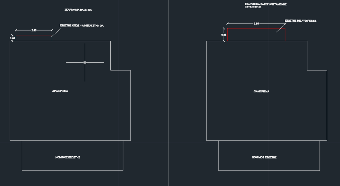 Καλησπέρα συνάδελφοι, Είμαι νέος μηχανικός και δεν έχω μεγάλη εμπειρία σχετικά την απαίτηση ΜΣΕ η τεχνικής έκθεση στατικού ελέγχου. Πρόκειται για διαμέρισμα σε πολυκατοικία του 2000 όπου υπάρχει αυθαιρεσία σε έναν από τους εξώστες. Στην Ο.Α. ο εξώστης έχει διαστάσεις 0,40 χ 2,40 μ ενώ στην πράξη έχει διαστάσεις 0,85 χ 3,85. Στην πράξη υπάρχει και μία μετακίνηση του εξώστη ως προς τη θέση που φαίνεται στη Ο.Α. . Πιο αναλυτικά, φαίνεται στο παρακάτω σκαρίφημα. Με βάση το την απόφαση 1643/11.05.2018 Δεν απαιτείται υποβολή μελέτης στατικής επάρκειας αλλά τεχνική έκθεση αρμόδιου μηχανικού στις εξής περιπτώσεις: ..... γ) αυθαίρετες κατασκευές προβόλων οι οποίοι προεξέχουν έως 2.00 μέτρα ή αυθαίρετες επαυξήσεις της προεξοχής τους μέχρι ποσοστού 25%, Στην περίπτωσή μου μπορώ να αναφερθώ στο ότι επειδή ο εξώστης είναι μικρότερος των 2 μέτρων δεν είναι απαραίτητη η ΜΣΕ ή θα πρέπει να το θεωρήσω σαν επαύξηση της προεξοχής > 25% και να κάνω ΜΣΕ. Να σημειωθεί ότι έχω παρατηρήσει και διαφορές και ως προς τον ξυλότυπο της οικοδομής. Θα ήθελα να ρωτήσω αν αυτό επηρεάζει κάπως στην απαίτηση ή όχι για Μελέτη Στατικής Επάρκειας;