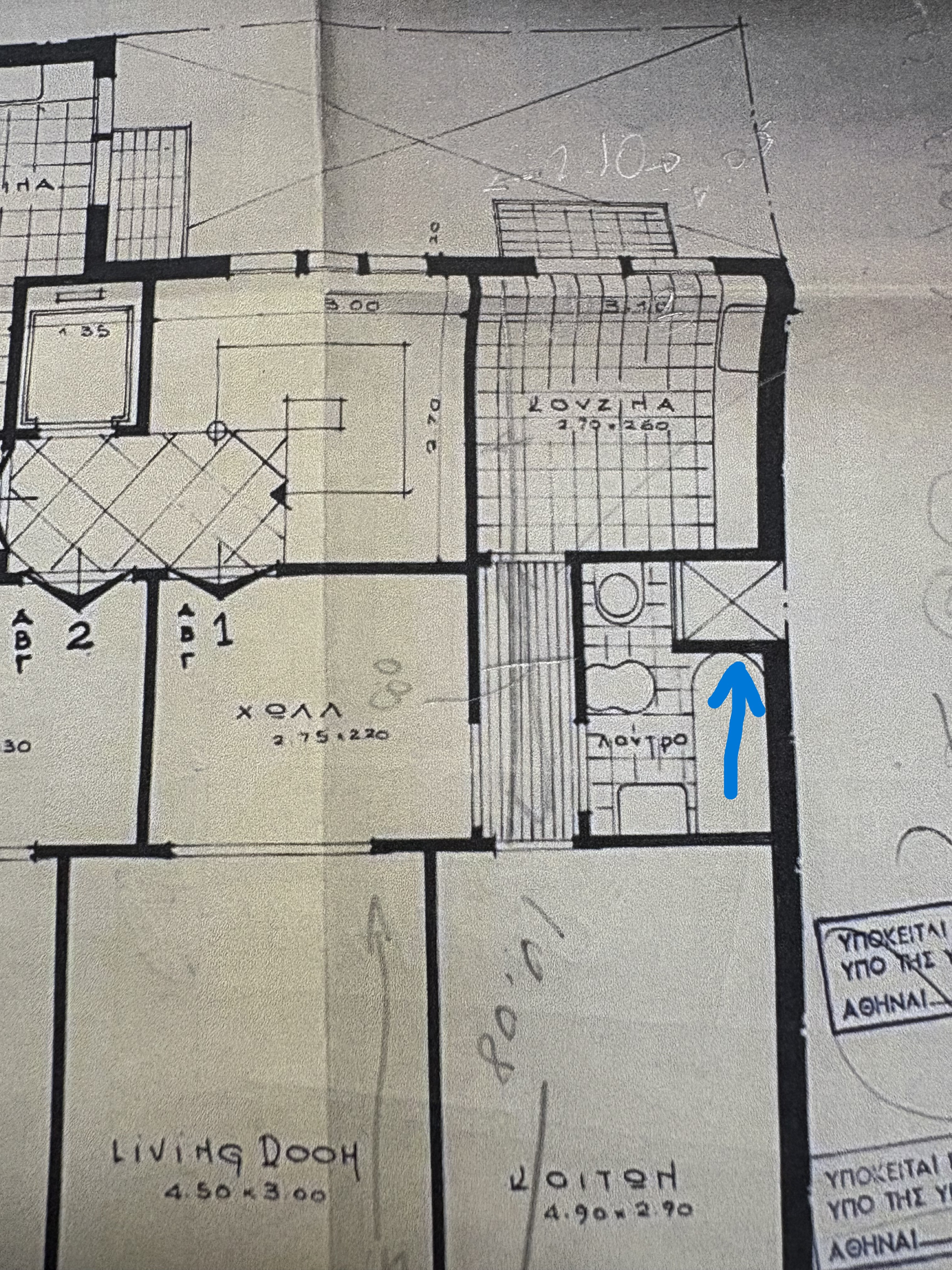 (Μεταφέρθηκε στο παρόν θέμα. Pavlos 33) Καλησπέρα σας, μετά από καταμέτρηση ενός διαμερίσματος του 1968 η μόνη διαφοροποίηση επί της αδείας είναι η θέση του παραθύρου του μπάνιου στο τοίχο που έχει τοποθετηθεί το βέλος. Η εμβαδομέτρηση ήταν αρκετά ακριβής με αποτέλεσμα να μην υπήρχε κάποια άλλη παρατήρηση επί του ακινήτου. Επίσης η εν λόγω διαφοροποίηση προήλθε σίγουρα εκ κατασκευής καθώς έχει αλλάξει και η τοποθεσία της λεκάνης και της μπανιέρας. Θα ανοίγατε καρτέλα για την εν λόγω παράβαση; Σας ευχαριστώ