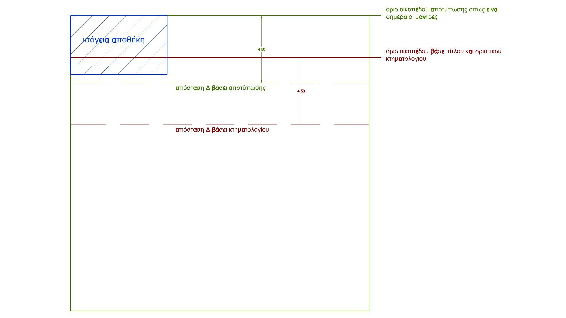 Καλημέρα...έχω μία περίεργη περίπτωση. Έχω οικόπεδο που θέλω να φτιάξω νέα οικοδομή. Το οικόπεδο μου έχει τα πράσινα όρια στην πράξη όπως αποτυπώνεται με τις μάντρες και τα κτίσματα σήμερα. Όμως από μελέτη τίτλων και με βάση και το οριστικό κτηματολόγιο, ο ιδιοκτήτης φαίνεται να έχει μπει μέσα στον πίσω γείτονα. Δηλαδή τα σωστά όρια βάσει τίτλων και κτηματολογίου είναι τα κόκκινα. Φυσικά έτσι λόγω απόστασης Δ του τελικού ορίου και καθώς δεν έχω μεγάλο βάθος, χάνω κάλυψη και δόμηση. Τι θέλω να ρωτήσω τώρα...Ο ιδιοκτήτης μου, έχει φτιάξει κολλητά στο πίσω "καταπατημένο" όριο μία ισόγεια αποθήκη πιθανότατα χωρίς άδεια και πολύ παλιά σίγουρα προ 75. Με τα νέα όρια η αποθήκη αυτή καταλήγει να είναι του γείτονα....! Μπορώ έτσι εγώ να ισχυριστώ ότι ο πίσω γείτονας έχει έτσι ισόγειο κτίσμα κολλητά σε εμένα και να κολλήσω το νέο μου κτίριο στο πίσω όριο ? Μετράνε αυτά τα παλιά αποθηκάκια γύρω στα 5μ2 σαν κτίσματα για τη θέση κτιρίου ?