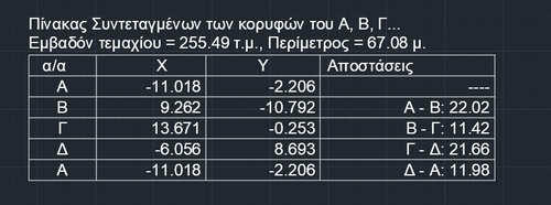 Σημειώσεις: Ως font style χρησιμοποιεί το επί του παρόντος επιλεγμένο και λειτουργεί καλύτερα χωρίς annotative style ή/και με height 0. Ξεκίνησα να προσθέσω ρυθμίσεις σταθερές ως επιλογή για να μην επιλέγεις κάθε φορά π.χ. "γράμματα ναι/σημεία ναι/δεκαδικά #" αλλά έμεινε ως TODO. Επίσης: α) Οι PLINE καλό είναι να είναι ορθά κλειστές με το property "closed" και όχι κυριολεκτικά να συμπίπτει το τελευταίο με το πρώτο σημείο γιατί χαλάει η τελευταία σειρά του πίνακα (ή και η περίμετρος) β) Ενδεχομένως λόγω AutoCAD bug το 'Linetype generation' property πρέπει να είναι OFF για να τυπωθεί ξανά το πρώτο σημείο στον πίνακα γ) Εάν θέλετε να έχουν αντίστροφη αρίθμηση τα σύμβολα τρέξτε REVERSE στο PLINE.