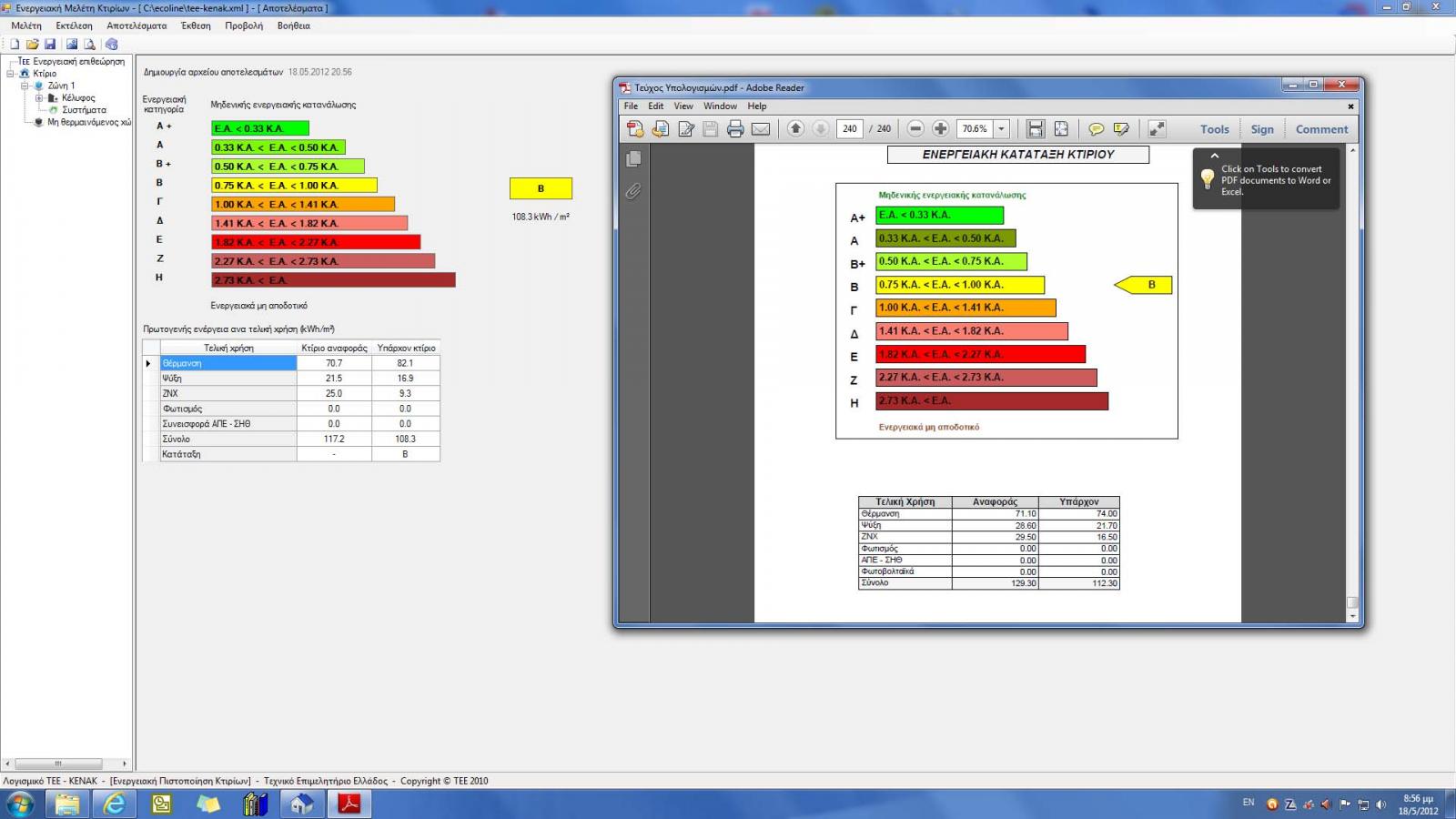 Silent Arrow Δημοσιεύτηκε May 18, 2012 at 06:10 μμ Δημοσιεύτηκε May 18, 2012 at 06:10 μμ (edited) Παιδια, ειδικα οσοι ειναι Ενεργειακοι Επιθεωρητες και γνωριζουν απο κοντα και τις παλαιοτερες εκδοσεις του ΤΕΕ ΚΕΝΑΚ, λιγη βοηθεια.... Παρατηρω εντονες αποκλισεις στα αποτελεσματα της νεας εκδοσης ΤΕΕ ΚΕΝΑΚ v1.29 με την παλαιοτερη v1.28. Συγκεκριμενα το Κτιριο Αναφορας εχει πολυ καλη αποδοση πλεον στην Θερμανση. Εχω επισυναψει μια φωτογραφια οπου εχω τρεξει μια παλια ΜΕΑ με την εκδοση v1.29 και πλεον χάνω κατα κράτος στη Θερμανση απο το Κτιριο αναφορας. Με την παλια εκδοση v1.28 (δεξια στην εικονα, ενα ανοιγμενο αρχειο pdf) τα αποτελεσματα στην Θερμανση ηταν πολυ κοντα, τωρα εχω μεγαλη αποκλιση. Με την εκδοση v1.28 ημουν στο 0.87 τώτα με την νεα εκδοση πηγα στο 0.92 (λιγο ακομα και θα εβγαινα Γ...). Το χειροτερο δεν μπορω να δικαιολογησω ποιοτικα αυτη την ραγδαια αλλαγη στη Θερμανση. Any ideas? Edited May 18, 2012 at 06:12 μμ by Silent Arrow