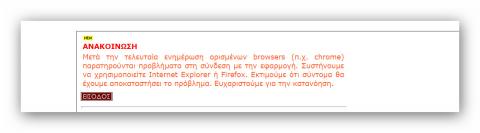 TAKIS1975 Δημοσιεύτηκε November 25, 2014 at 10:45 πμ Δημοσιεύτηκε November 25, 2014 at 10:45 πμ ΑΝΑΚΟΙΝΩΣΗ Μετά την τελευταία ενημέρωση ορισμένων browsers (π.χ. chrome) παρατηρούνται προβλήματα στη σύνδεση με την εφαρμογή. Συστήνουμε να χρησιμοποιείτε Internet Explorer ή Firefox. Εκτιμούμε ότι σύντομα θα έχουμε αποκαταστήσει το πρόβλημα. Ευχαριστούμε για την κατανόηση.