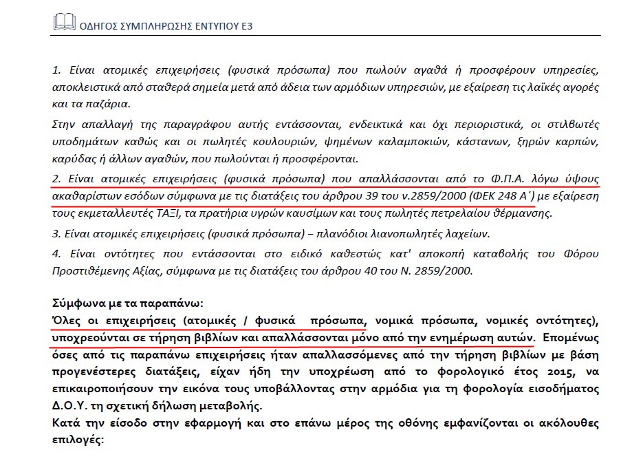 dib Δημοσιεύτηκε May 4, 2018 at 10:47 πμ Δημοσιεύτηκε May 4, 2018 at 10:47 πμ Καλημέρα Στη σελ. 3 του οδηγού Ε3/2018, λέει αυτό που γράφει (υπογραμισμένο) στο συννημένο ... Μπορεί κάποιος να μου εξηγήσει τι εννοεί ο ποιητής όταν λέει οτι : υποχρεούται σε τήρηση βιβλίων (ΟΚ το καταλαβαίνω) ... αλλά απαλλάσεται απο την ενημέρωση αυτών ? Ποιό είναι αυτό που απαλλάσεται ????? Μάλλον πρέπει να μιλάνε άλλη γλώσσα εκεί μέσα στην ΑΑΔΕ