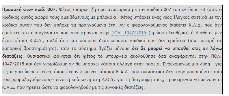 marfilippos Δημοσιεύτηκε May 9, 2018 at 07:00 μμ Δημοσιεύτηκε May 9, 2018 at 07:00 μμ (edited) Έστειλα την όλη κατάσταση. Ότι υπάρχει μη χρησιμοποιούμενο δευτερεύον ΚΑΔ που εμποδίζει την επιλογή ΝΑΙ στον κωδικό 007 στο Ε3 και πως μπορώ να το ξεπεράσω... Edited May 9, 2018 at 07:00 μμ by marfilippos