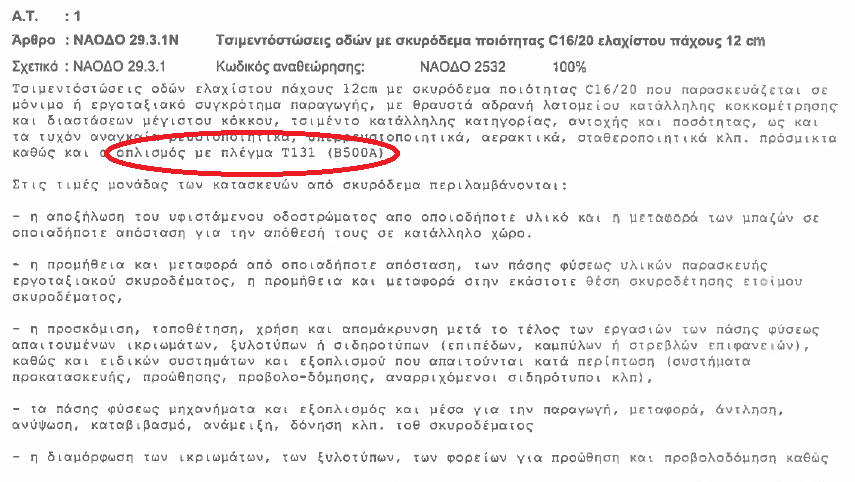 civeng Δημοσιεύτηκε March 12, 2020 at 07:29 μμ Δημοσιεύτηκε March 12, 2020 at 07:29 μμ (edited) On 9/3/2020 at 8:49 ΜΜ, Adamtsi said: Σας ευχαριστώ πολύ! Επισυνάπτω εδώ το άρθρο. άρθρο τσιμεντόστρωσης.pdf 481 kB · 14 downloads Η περιγραφή του άρθρου έχει γίνει πολύ πρόχειρα από την αναθέτουσα (βλ ορθογραφικά). Από το ΦΕΚ 1746/19.05.2017 έχουν αντιγράψει την περιγραφή του Ενιαίου άρθρου Β-29 - ΚΑΤΑΣΚΕΥΕΣ ΑΠΟ ΣΚΥΡΟΔΕΜΑ αλλά έχουν προσθέσει το "...καθώς και ο οπλισμός με πλέγμα Τ131 (Β500Α)." Θέλουν μάλλον να μην πληρώσουν τον οπλισμό ξεχωριστά. Αφού όμως ξέχασαν να αναφέρουν ρητώς στην περιγραφή ότι στην τιμή μονάδος περιλαμβάνεται και ο απαιτούμενος βάσει μελέτης οπλισμός, τότε θα απαιτήσεις να τον πληρωθείς ξεχωριστά. Edited March 12, 2020 at 07:32 μμ by civeng