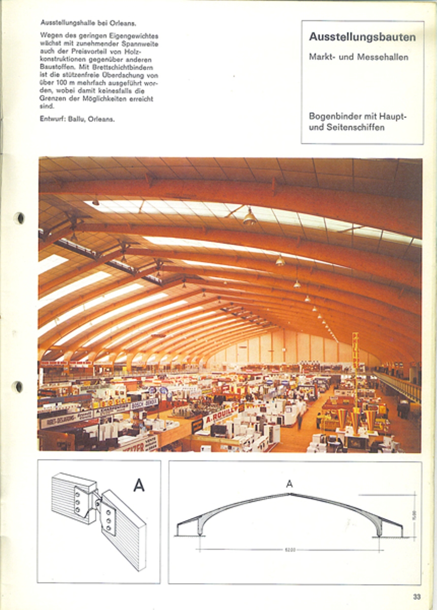 holz 033Εκθεσιακός χώρος στην OrleansΛόγω του μικρού ίδιου βάρους όσο μεγαλύτερο το άνοιγμα τόσο οικονομικότερη η κατασκευήΈχουν ήδη κατασκευασθεί ανοίγματα>100,00μ χωρίς αυτό να σημαίνει ότι φθάσαμε στα όρια των δυνατοτήτων.Άνοιγμα:62,00μ Ύψο
