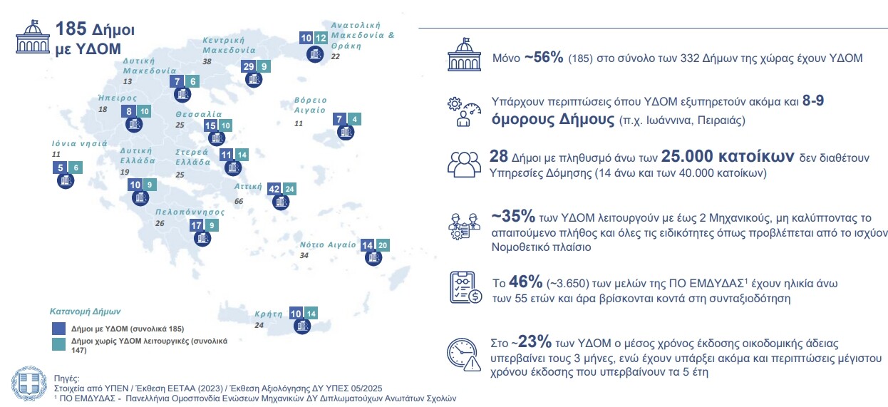 Το σημερινό πλαίσιο παρουσιάζει διαφοροποιήσεις στην εφαρμογή των διαδικασιών και στη διαθεσιμότητα ψηφιακών εργαλείων μεταξύ διαφορετικών περιοχών. Σε πανελλαδική αξιολόγηση του ΥΠΕΣ (05/2025), οι Υπηρεσίες Δόμησης (ΥΔΟΜ) καταγράφουν μέση βαθμολογία 3,4/10, ένδειξη ότι η αποτελεσματικότητα, η απλοποίηση και ψηφιοποίηση αποτελούν προτεραιότητα για τους πολίτες. Στο 23% των ΥΔΟΜ ο μέσος χρόνος έκδοσης οικοδομικής άδειας υπερβαίνει τους 3 μήνες. Έχουν καταγραφεί και περιπτώσεις ιδιαιτέρως σύνθετων φακέλων, όπου ο χρόνος έκδοσης οικοδομικής άδειας ξεπέρασε τα 5 έτη. Από τους 332 δήμους της Χώρας, μόνο 185 διαθέτουν σήμερα ΥΔΟΜ – δηλαδή περίπου 56%. 147 δήμοι δεν διαθέτουν ΥΔΟΜ, ενώ 28 δήμοι με πληθυσμό άνω των 000 κατοίκων και 14 δήμοι με πληθυσμό άνω των 40.000 κατοίκων δεν διαθέτουν ΥΔΟΜ. Περίπου 35% των ΥΔΟΜ λειτουργούν με έως δύο μηχανικούς, αριθμός που δεν επαρκεί για να καλύψει όλες τις ειδικότητες που απαιτεί η κείμενη πολεοδομική νομοθεσία. Ορισμένες ΥΔΟΜ εξυπηρετούν πολλαπλούς όμορους δήμους, φτάνοντας σε κάποιες περιπτώσεις να καλύπτουν έως και 8-9 δήμους. Όλα τα παραπάνω στοιχεία ανέδειξαν την ανάγκη να δημιουργηθεί ένας ενιαίος εθνικός φορέας.