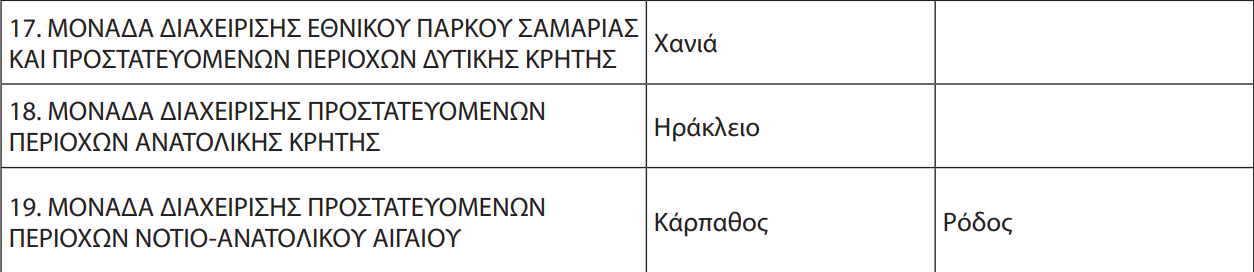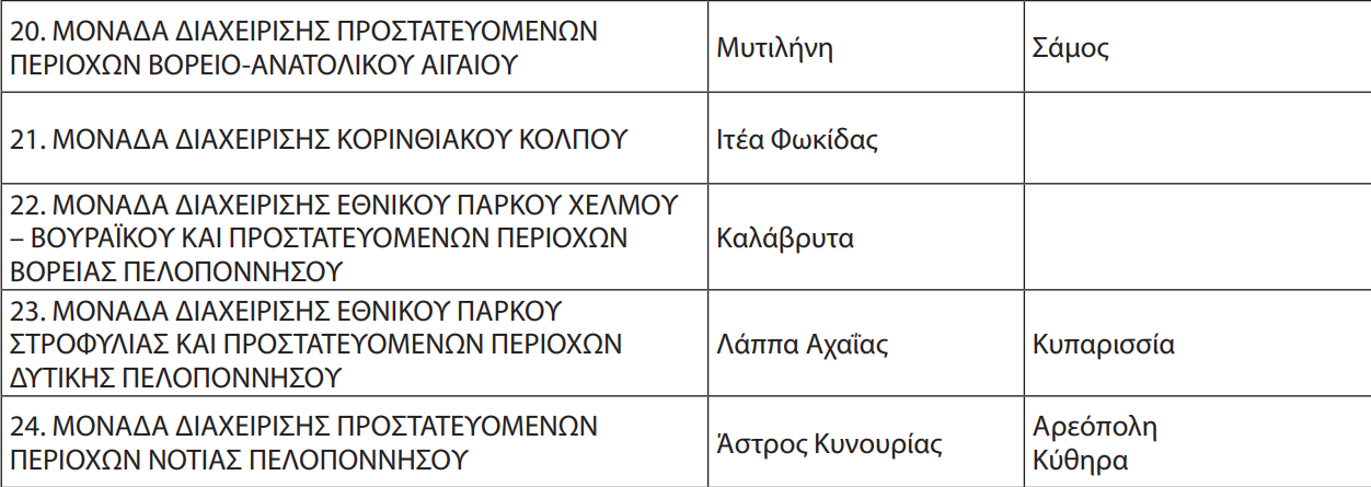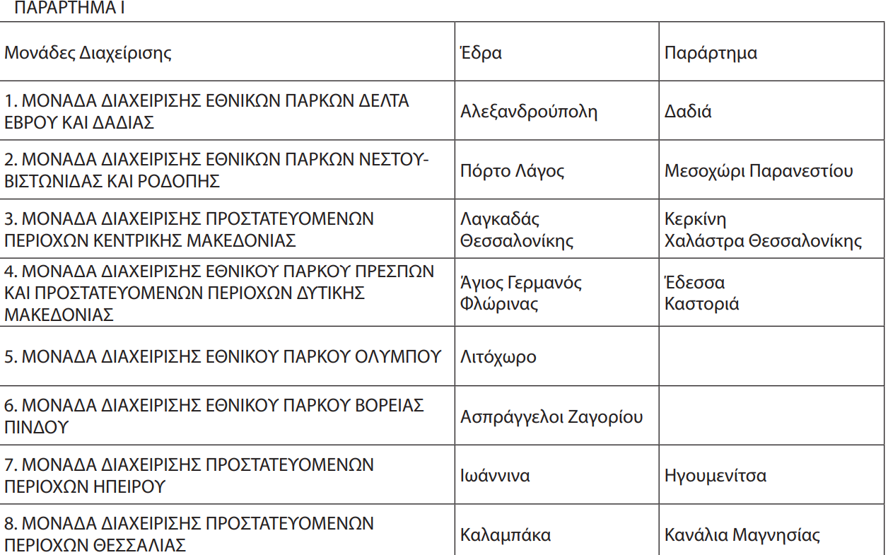 Ονομασία, Έδρες και Παραρτήματα των Μονάδων Διαχείρισης Προστατευόμενων Περιοχών