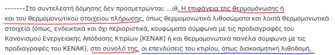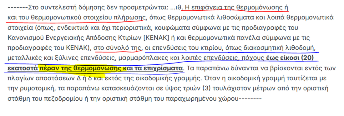Ο νόμος λέει : η θερμομόνωση και τα θερμομονωτικά στοιχεία στο σύνολό τους (έμεινε το "της" επειδή η θερμομόνωση αρχικά ήταν μόνη της), οι επενδύσεις έως 20εκ πέραν της θερμομόνωσης (δηλ. των προηγουμένων) και τα επιχρίσματα (δώρο) όπως πάντα. Ο υπάλληλος της πολεοδομίας να ξαναγραφτεί στο σχολείο (υπάρχουν και δεύτερης ευκαιρίας) ή να πάει σπίτι του.1 point
