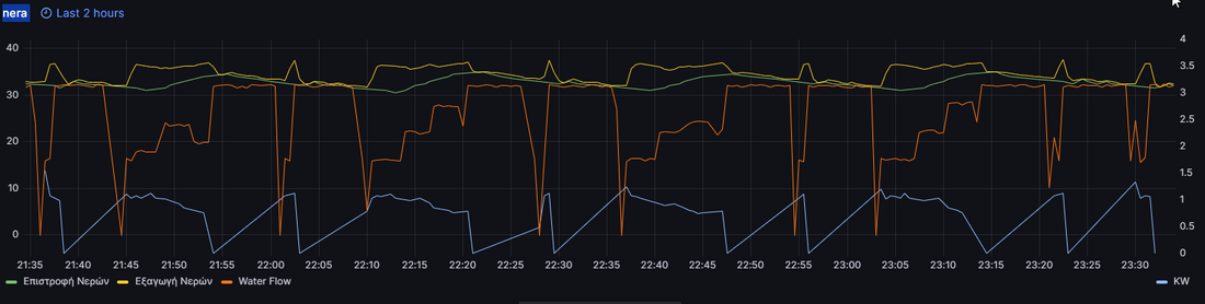 Καλημέρα και ευχαριστώ Κωνσταντίνε για την απάντηση. Προσωπικά δεν την φοβάμαι την επανεκκίνηση, αλλά αν το κάνει μια μονάδα inverter σε κύκλους των 5-10 λεπτών, με προβληματίζει γιατί δεν συνάδει με την λειτουργία ενός inverter μηχανήματος, που η φιλοσοφία του είναι να προσαρμόζει την απόδοσή του στο φορτίο, επιτυγχάνοντας πιο σταθερή και οικονομική λειτουργία. Τέλος πάντων μην τα πολυλογώ, μετά από παρεμβάσεις σε ρυθμίσεις (κυριότερα αυτή που συζητήθηκε παραπάνω) πήγαμε χθες στο παρακάτω διάγραμμα: Το οποίο παραπέμπει σε πολύ σταθερότερη λειτουργία. Με κόκκινο είναι η εξωτερική θερμοκρασία, πορτοκαλί η ροή νερού (L/min). Αυτό που βλέπω πλέον είναι μια προβλεπόμενη λειτουργία: Η μονάδα παίρνει μπροστά, καθώς πιάνει εύκολα το ΔΤ ρίχνει την παροχή και αντίστοιχα πέφτει η ισχύς του συμπιεστή, και όταν δεν μπορεί να πέσει άλλο, τότε σβήνει (~20.40). Μετά με σβηστό τον συμπιεστή κάνει ο κυκλοφορητής "δειγματοληπτική λειτουργία" για να τσεκάρει θερμοκρασία νερών, όταν πέσουν τα νερά τότε ξαναπαίρνει και βλέπουμε ότι από τις 21.00 μέχρι τις 21.45 δουλεύει αδιάλλειπτα. Θεωρώ ότι είναι και χαμηλό το φορτίο, γιατί είναι σχετικά υψηλή η εξ. θερμοκρασία (στους 15~13 βαθμούς) αν βάλει κρύο η αντλία θα δουλεύει περισσότερο εντός του πεδίου λειτουργίας του inverter οπότε δεν θα χρειάζεται να κόψει. Εμπειρικά (δεν το γράφει κάπου) δεν μπορεί να πέσει κάτω από τα 500watt περίπου! Επομένως θεωρώ ότι το βασικό θέμα ρύθμισης για αντιμετώπιση της διακοπτόμενης λειτουργίας, επιτεύχθηκε!