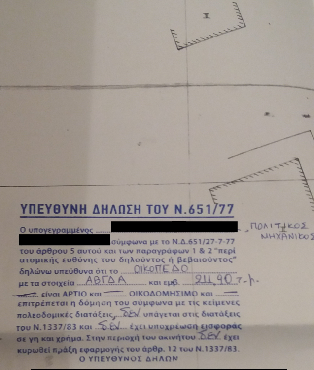 Η ερώτηση μου έγινε με αφορμή έναν συνάδελφο μου που του ζήτησε η συμβολαιογράφος να του υπογράψει το τοπογραφικό με το οποίο θα συνόδευε τη βεβαίωση σε εντός σχεδίου μέσα στο κέντρο της Θεσσαλονίκης. Και πάνω στην συζήτηση μου ανέφερε ότι το κειμενάκι με το οποίο υπέγραψε το έχει κάνει και σφραγίδα. Επειδή όλα αυτά μου φάνηκαν παράξενα είπα να ρωτήσω μήπως υπάρχει υποχρέωση κάποιας δήλωση μηχανικού που πρέπει να κάνουμε πάνω στα σχέδια, όπως αντίστοιχα κάνω για τα σχέδια που υποβάλλω για τις ρυθμίσεις αυθαιρέτων, ότι π.χ. "Δηλώνω ότι, έχω στη διάθεση μου όλα τα δικαιολογητικά στοιχεία και τις μελέτες και τα υπέβαλα ηλεκτρονικά εντός της προβλεπόμενης από το Ν.4495/2017 προθεσμίας. Το παρόν σχέδιο είναι ταυτόσημο με αυτό που έχει εισαχθεί σε ηλεκτρονική μορφή." Και για του λόγου το αληθές επισυνάπτω και την εικόνα. Ξαναδημοσιεύω για να μπορέσετε να το δείτε.