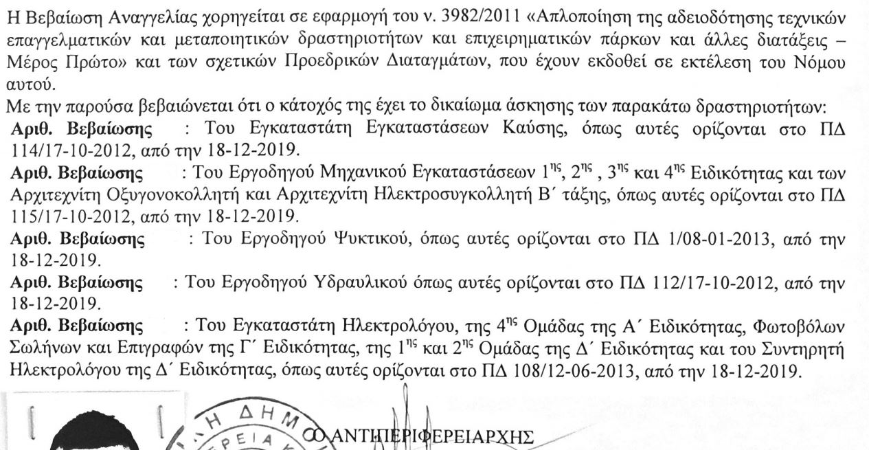 Καλησπέρα συνάδελφε, Εγώ πέρσι τον Γενάρη πήρα τις αναγγελίες οπότε δεν νομίζω να έχει αλλάξει κάτι από τότε. Πήρα συγκεκριμένα: Εγκαταστάτης εγκ/εων καύσης (ΠΔ 114/12) Εργοδηγού (ΠΔ 115/12) Εργοδηγού ψυκτικού (ΠΔ 1/13) Εργοδηγού υδραυλικού (ΠΔ 112/12) Εγκαταστάτη ηλεκτρολόγου (ΠΔ 108/13). Αυτή είναι για να υποβάλλεις ΥΔΕ στη ΔΕΗ αν σε ενδιαφέρει. Τα πήρα μετά από (επί τόπου) αίτηση στη Διευ/νση Ανάπτυξης της περιφέρειας και παράβολο 17 κάτι ευρώ. Λες να διαφέρει η διαδικασία από περιφέρεια σε περιφέρεια? περίεργο.. -