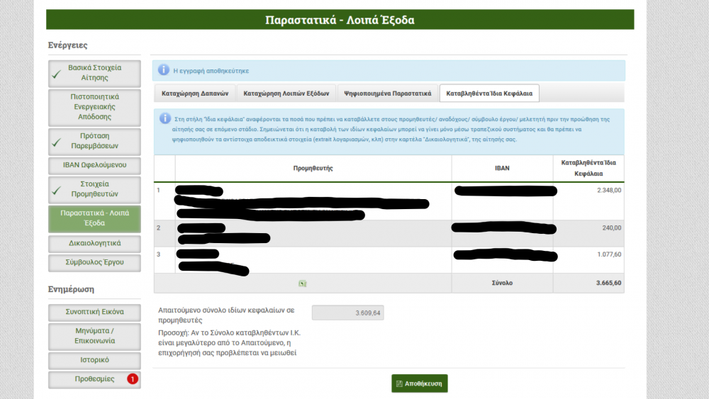 Καλημέρα, στην αίτηση της φωτογραφίας όταν βάζω το ΙΚΑ της θερμομόνωσης στις Δαπάνες/Εισφορές, μειώνεται το Απαιτούμενο σύνολο ιδίων κεφαλαίων σε προμηθευτές σε σχέση με τα Καταβληθέντα Ίδια Κεφάλαια. Δε θα έπρεπε να είναι τα ίδια ποσά; *Η διαφορά τους ισούται με το 60% του ΙΚΑ -