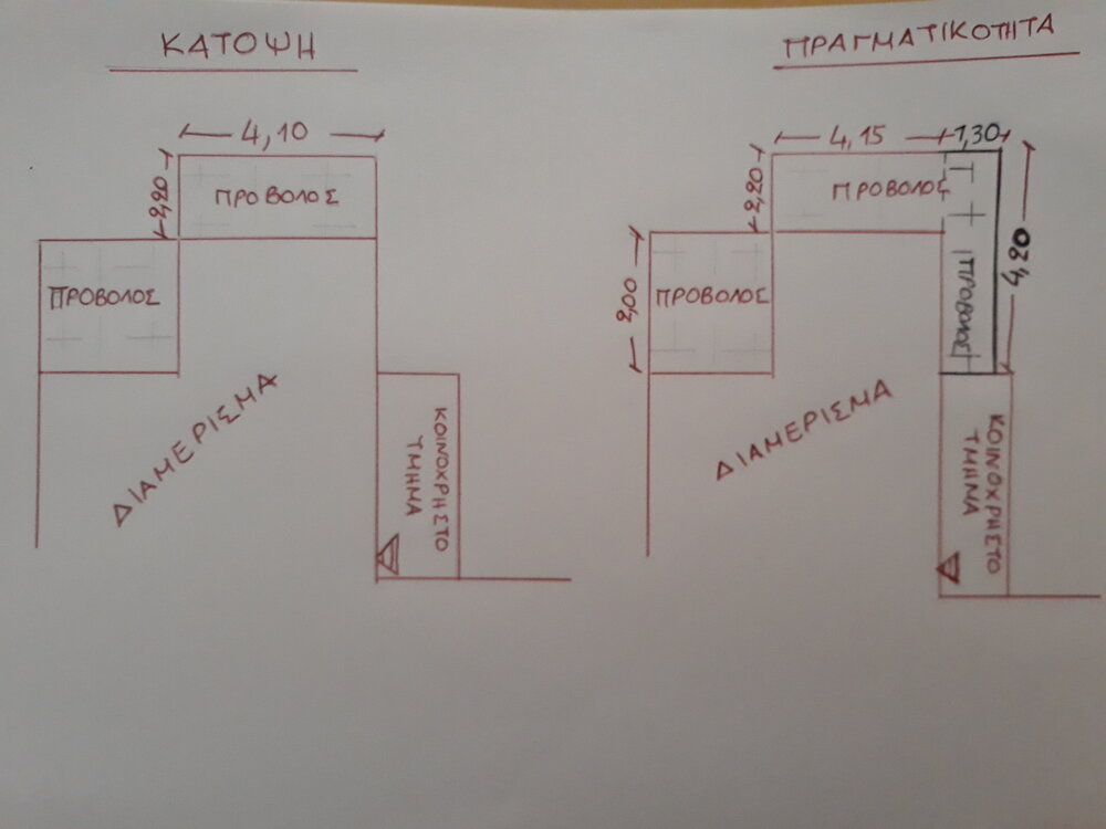 Καλησπέρα,αν κάποιος μπορούσε να δώσει μία σχετικά άμεση απάντηση στο παρακάτω ερώτημα θα το εκτιμούσα, Όπως βλέπετε στην εικόνα, κατά την ανέγερση του διαμερίσματος(1996) δημιουργήθηκε επιπλέον τμήμα εξώστη 1,30x4,20. 1) Η απαίτηση ή μη Μ.Σ.Ε για προβόλους προκύπτει από τον Ν.4495 αρ.99 /η/ββ /δδδ που λέει ότι δεν απαιτείται Μ.Σ.Ε. για ''πρόβολοι με προσαύξηση μέχρι τριάντα τοις εκατό (30%) του εμβαδού τους και μέχρι είκοσι πέντε τοις εκατό (25%) του πλάτους τους '' ή από την ΥΠΕΝ/ΔΑΟΚΑ/19409/1507 αρ.2/γ που λέει ότι δεν απαιτείται Μ.Σ.Ε για '' αυθαίρετες κατασκευές προβόλων οι οποίοι προεξέχουν έως 2.00 μέτρα ή αυθαίρετες επαυξήσεις της προεξοχής τους μέχρι ποσοστού 25% '' ? 2) Αυτό το αυθαίρετο τμήμα προβόλου 1,30x4,20 και με τη μορφή που έχει πως μπορεί να θεωρηθεί και να αντιμετωπιστεί ώστε να αποφευχθεί η Μ.Σ.Ε?
