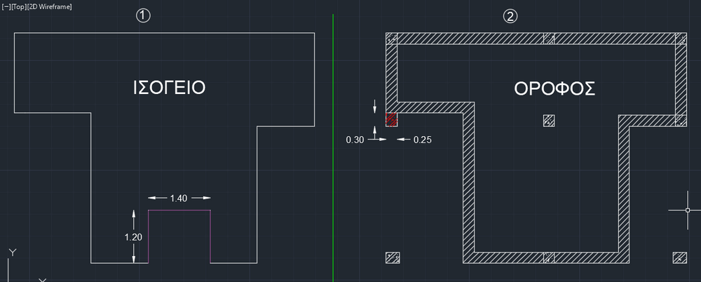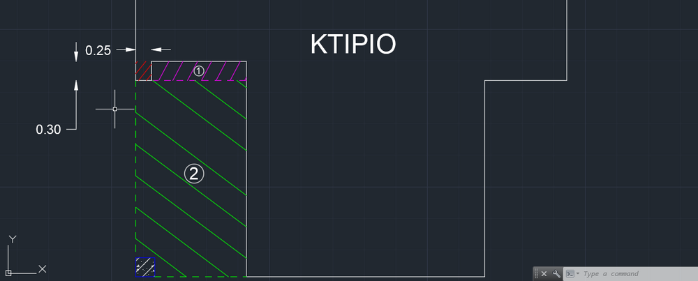 Καλησπέρα, από το παρακάτω σχήμα προκύπτει ότι υπάρχουν δύο ημιυπαίθριοι χώροι, ένας με τη μωβ διαγράμμιση και ο δεύτερος με τη λαχανί διαγράμμιση αντί να θεωρηθεί ότι υπάρχει ένας ενιαίος ημιυπαίθριος χώρος που θα είναι (1+2)? Το τμήμα του κτιρίου με την κόκκινη διαγράμμιση και διαστάσεις 0,30 x 0,25 (υποστύλωμα) συμπεριλαμβάνεται στη δόμηση ? -
