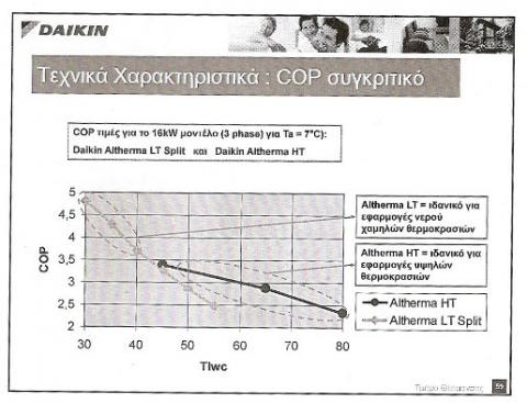 λοιπον φιλοι μολις χθες χωθηκα σε σεμιναριο αντλιων θμοτητας και λεω χωθηκα γιατι δεν ειμαι εμπορος ουτε χονδρεμπορος ουτε τεχνικος τις εταιρειας διαβασα λιγο βιαστηκα το θρεντ και γενικα ειδα καποια πραγματα που μου κατσαν καπως τι σχεση καταρχας εχει αν τα σωματα των υψηλων ειναι μονο για 90-80 προσαγωγη.... δηλ αν σταλει 60 βαθμους νερο δε θα λειτουργουν? ποιος το λεει αυτο? αυτες οι τιμες ειναι ονομαστικες και για το πικ λειτουργιας η αντλια ποιος σας ειπε οτι θα λειτουργει μονιμα στους 90 για να χει cop χαμηλο? καταρχας σημαντικο ρολο στην καλη αποδοση της αντλιας ειναι οτι η εσωτερικη μοναδα πρεπει να ναι σε προστατευμενο χωρο διοτι εκει ειναι ο δευτερος συμπιεστης του 134α οπου παραλαμβανει την αυξηση του πρωτου στους 35 - 40 και την παει μεχρι 80 ΑΝΑΛΟΓΑ την ζητηση..... υστερα το σταρτ απ γινετε δυνατα η αντλια δινει δινει μεχρι να πιασει την απαιτηση μετα ΣΥΝΤΗΡΕΙ με 40-60 βαθμους ... αρα με τι cop?????? (και δουλευει 24ωροοοο) διατηρει ενα ΔΤ 10 βαθμων μεταξυ επιστροφης προσαγωγης και εκει ινβερταρει ο κυκλοφορητης ή ο συμπιεστης -