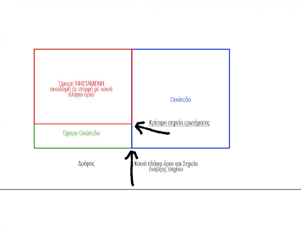 19. Καλησπέρα, σε όμορα οικόπεδα στο κοινό πλάγιο όριο υπάρχει υφιστάμενη οικοδομή του γείτονος η οποία και οπισθοχωρεί από την οικοδομική γραμμή στο πρόσωπο του δρόμου (οικοδομική και ρυμοτομική συμπίπτουν)... θέλω να δημιουργήσω τοιχίο - περίφραξη στο δικό μου, αυτό που θέλω να ρωτήσω είναι: στο κοινό μας όριο (κοινή πλευρά) με τον γείτονα, ξεκινάω από το όριο στο σημείο που η ρυμοτομική μ γραμμή έρχεται σε επαφή με το πεζοδρόμιο και δημιουργώ τοιχίο με πάχος προς την δικιά μου ιδιοκτησία... μέχρι εδώ καλώς... από το σημείο που ξεκινάει η υφιστάμενη οικοδομή οποία είναι σε επαφή με το κοινό μας όριο, συνεχίζω το τοιχίο κανονικά κατά μήκος όλης της κοινής πλευράς και με την έξω του πλευρά σε επαφή με το κτίριο του γείτονα και την μέσα πλευρά όπως και πριν μέσα στο οικόπεδό μου; ή δεν έχει νόημα να συνεχίσω το τοιχίο καθότι ουσιαστικά ο τοίχος της διπλανής οικοδομής μας οριοθετεί; Σε αυτή την περίπτωση, αν το σταματήσω εκεί που ξεκινάει η οικοδομή του γείτονος δεν θα δημιουργηθεί "δοντάκι"; Να σημειώσω εδώ πως το τμήμα του οικοπέδου μου που είναι σε επαφή δεν πρόκειται να χτιστεί μελλοντικά καθότι είναι ακάλυπτος (έχω κολλήσει το δικό μου από την άλλη πλευρά), εξ ου και η επιθυμία δημιουργίας τοιχίου... Επισυνάπτω και σχετικό αρχείο: