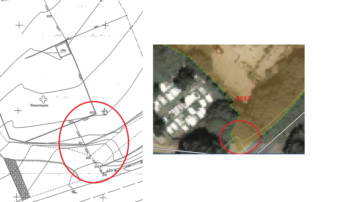 Καλημέρα Didonis και ευχαριστώ για την απάντησή σου ...ο τίτλος, η άδεια οικοδομής , η πράξη χαρακτηρισμού και το τοπογραφικό που τα συνόδευε είναι του 2005 ... αναμένω το νέο τοπογραφικό απο τον πωλητή που ίσως ξεκαθαρίσει τη διαφορά μεταξύ τίτλων και κτηματολογίου (το οποίο και θα δώσω στο μηχανικό μου για τα περαιτέρω) . Αυτό που εγώ παρατηρώ απο την οθόνη του υπολογιστή είναι πως τα όρια του γηπέδου απο το υπάρχον τοπογραφικό , σε μια συγκεκριμένη πλευρά του δεν έχουν καμία απολύτως σχέση με τα όρια του Κτηματολογίου στο σημείο αυτό (μιλάμε για εντελώς άλλο σχήμα όπου το κτηματολόγιο σχεδόν επεκτείνει το γήπεδο μέσα σε δρόμο (το τσιμέντο που φαίνεται στο φόντο του χάρτη) ...δηλαδή απο το Ε23 του τοπογραφικού και κάτω δε βρίσκω ''αντιστοιχίες'' με το χάρτη του κτηματολογίου (πχ το Ε22 απέχει απο το Ε23 5,47 μέτρα ενώ στο κτηματολόγιο φαίνεται σαφώς μικρότερο και μετά ξεκινάει η αναρχία μέχρι το Ε16 όπου αποκαθίσταται το φαινόμενο περίγραμμα σε συμφωνία με το κτηματολόγιο . Κατανοώ πως θα υπάρχουν αποκλίσεις λόγω διαφορετικής μεθόδου/ακρίβειας μέτρησης αλλά θεωρούσα πως οι κορυφές θα εξάγουν παρόμοιο σχήμα γηπέδου .