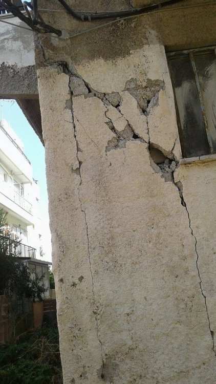 Διάβρωση σίγουρα.Καθαίρεση επιχρισμάτων για περισσότερο έλεγχο. Λοξη γραμμή (χιαστι ) Βαθμος βλάβης C διατμητικη αστοχία (συνδετήρες ανά 20cm να υποθέσω και ανοικτοι) στην κρίσιμη περιοχή.Βλέπεις και το παραθυράκι συμβάλλει και αυτό (κοντο υποστυλωμα).Σιγουρα σαθρο ενανθρακωμενο σκυροδεμα χαμηλης κατηγοριας με δονηση κουδουνιστρας .