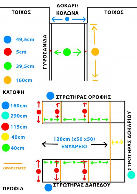 2. Καλησπέρα σε όλα τα μέλη. Να αρχίσω λέγοντας ότι είμαι ιδιώτης (όχι μηχανικός), αλλά επειδή πιάνουν τα χέρια μου, αποφάσισα να κάνω μια κατασκευή διαχωριστικού με γυψοσανίδα, στην οποία θα ενσωματώσω και διαμπερές ενυδρείο. Έχω διαβάσει αρκετά και έχω δει αρκετά videos σχετικά με την διαδικασία τοποθέτησης γυψοσανίδας στον μεταλλικό σκελετό που αποτελείται από στρωτήρες και ορθοστάτες, όμως δεν έχω καμία εμπειρία στο αν αυτό που έχω στο μυαλό μου σαν σχέδιο και που έχω προσπαθήσει να το αποτυπώσω για να το δείτε, αν τελικά είναι εφικτό και ασφαλές. Πριν σας δείξω την εικόνα που έχω φτιάξει, να σας περιγράψω λίγο την κατάσταση. Υπάρχει εναιαίος χώρος τραπεζαρία με σαλόνι. Περίπου στο κέντρο ολόκληρου του τοίχου, υπάρχει δοκάρι/κολώνα που προεξέχει από τον τοίχο. Σε αυτό το σημείο, θέλω να κάνω το χώρισμα. Μερικές μετρήσεις: α) Μήκος δοκαριού/κολώνας: 49,5 cm β) Ύψος δοκαριού/κολώνας (μέχρι ταβάνι): 290 cm γ) Μήκος γυψοσανίδας (κάθετα στο δοκάρι): 160 cm Θα ήθελα να μου πείτε αν είναι εύκολο, αν έχω σχεδιάσει σωστά τον μεταλλικό σκελετό που θα ντυθεί με την γυψοσανίδα, καθώς και ό,τι άλλες σκέψεις έχετε πάνω σε αυτό. Ευχαριστώ πολύ εκ των προτέρων.