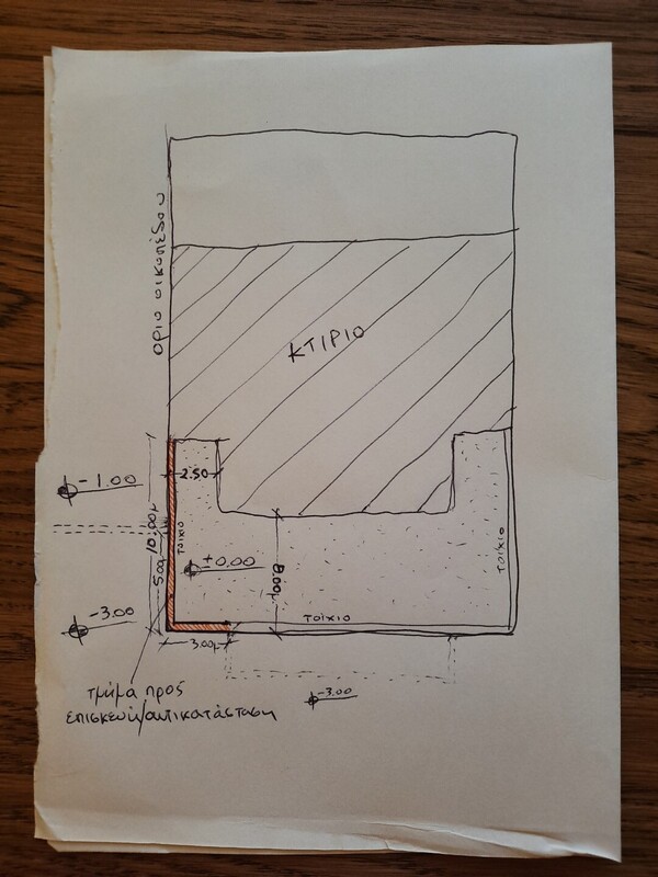 17. Συνάδελφοι παρακαλώ τη βοήθειά σας, για τη περίπτωση εργασιών επισκευής τοιχίου αντιστήριξης, με πλήρη αντικατάσταση ενός τμήματος του και επισκευές στο υπόλοιπο. Είχε γίνει πριν χρόνια μια συζήτηση εδώ στο φόρουμ (λινκ στο τέλος). Θα περίμενε κανείς ότι 10 χρόνια μετά κάτι τέτοια διαδικαστικά προβλήματα, θα έχουν λυθεί. Στις πολεοδομίες επικρατεί ακόμα σύγχυση όμως και δε βγαίνει άκρη. Το συνολικό τοιχίο εκτείνεται σε τρεις πλευρές του οικοπέδου, σε σχήμα Π. και εφάπτεται στο όριο. Είχε τακτοποιηθεί με τον ν.4030 ως προς το ύψος του. ( ύψος κλιμακωτο απο 1 έως 3μ.) Το τμημα προς αντικατάσταση (με χρώμα στο σκαρίφημα που επισυνάπτω), καλύπτει τη γωνία του οικοπέδου. Το τμήμα που χρειάζεται αντικατάσταση και επισκευές έχει μήκος 12μ. Καθώς έχει ρήγματα σε διάφορα σημεία του, το τμήμα θα πρέπει να κατεδαφιστεί και να θεμελιωθεί νέο, το οποίο θα κατασκευαστεί στις ίδιες διαστάσεις με το παλιό. Επισης λόγω μεγέθους του τοιχίου, οι εργασίες καθαίρεσης/ανέγερσης θα πρέπει να γίνουν τμηματικά (υπάρχει κίνδυνος υποσκαφης τμήματος της θεμελίωσης καθώς το κτίριο έχει θεμελιωθεί σε στάθμη ανωτερη κατα 1,5μ απο αυτή της θεμελ. του τοιχίου και απέχει μόλις 3-4μ απο αυτο) Α) Το ερώτημα είναι αν γίνεται να ενταχθούν όλες οι εργασίες σε ο.α. Κατηγορίας 3: η)τοίχοι αντιστήριξης, περιτοιχίσεις και περιφράξεις που δεν εμπίπτουν στην κατηγορία εργασιών δόμησης μικρής κλίμακας και με την επιφύλαξη των περιπτώσεων της Κατηγορίας 1 Και ι)εργασίες επισκευής και εργασίες αλλαγής διαρρύθμισης νομίμως υφιστάμενων κτιρίων που δεν εμπίπτουν στις περιπτώσεις του άρθρου 30. Με αυτόν τον τρόπο θα μπορουν να γινουν τμηματικά οι εργασιες, και να γίνει ενας τελικός έλεγχος δόμησης (Κατ.Α.) Αν θεωρήσουμε ότι πρέπει να εκδοθεί οικ. άδεια κατεδάφισης Κατ.1 και ύστερα ανέγερσης Κατ.3, τότε δημιουργείται πρόβλημα καθώς μέχρι να ολοκληρωθεί η επισκευή/αντικατάσταση θα έχω συνεχείς καθαιρέσεις και ανεγερσεις τμηματων. Το άλλο πρόβλημα είναι οτι θα πρέπει να καλώ ελεγκτή δόμησης για κάθε επιμέρους τμημα που θα καθαιρειται και θα αντικαθισταται. Β) Έστω ότι γίνεται χαρακτηρισμός του ως επικινδύνως ετοιμόρροπη κατασκευή(συμφωνεί η υδομ), τότε η κατεδάφιση γίνεται με έγκριση εκτέλεσης εργασιών. Όμως παραμένει το πρόβλημα της παράλληλης ύπαρξης καθαιρέσεων/ανεγέρσεων τμημάτων και άρα της ανάγκης να υπάρχουν δύο άδειες ταυτόχρονα που δεν επιτρέπεται (η Έγκριση Εκτ. Εργασιών για τις κατεδαφίσεις παράλληλα με την ο.α. Κατηγορίας 3 για τοιχία αντιστήριξης και επισκευές..) Γ) Το τμημα τοιχίου στο οποίο θα γίνουν εργασίες πρόκειται να αντικατασταθεί με ενα ίδιο και δε θα αλλάξει η μορφή που είχε. Σχετικά με το Συμβούλιο Αρχιτεκτονικής. θα χρειαστεί η γνωμοδότησή τους, αφου το οικόπεδο είναι σε απ. <100μ. από τον αιγιαλο, και με υψος>3μ. , σωστά;