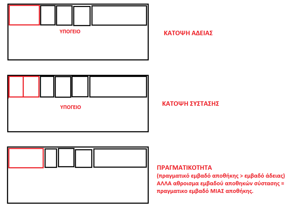 Καλησπέρα σε όλους και ζητώ συγγνώμη για τα σκαριφήματα. Τα ξαναπαραθέτω εδω και περιγράφω την κατάσταση: - Στην άδεια η αποθήκη είναι μία. - Στην πραγματικότητα η αποθήκη είναι μία, με υπέρβαση στη μία διάσταση εν συγκρίσει με την οικοδομική άδεια >5%. - Στη σύσταση οι αποθήκες είναι δύο (μεσοτοιχία) και το συνολικό εμβαδό και οι διαστάσεις των δύο αποθηκών είναι εντός επιτρεπτών αποκλίσεων με την πραγματικότητα. Και οι δύο ανήκουν στον ίδιο ιδιοκτήτη συμβολαιογραφικά. Στο Ε9 και στο κτηματολόγιο είναι δηλωμένες ως δύο. Σύμφωνα με τον ιδιοκτήτη (αλλά και τη θέση της πόρτας των αποθηκών) αγόρασε 'στα συμβόλαια΄ δύο, στην πραγματικότητα κατασκευάστηκε μία ενιαία. Ο ιδιοκτήτης θέλει να μεταβιβάσει. Καθώς στο ίδιο κτίριο έχει και διαμέρισμα με ΥΔ το οποίο θέλει να μεταβιβάσει επίσης, ζήτησε να τακτοποιηθεί πλήρως το θέμα των αποθηκών. Οι απορίες μου είναι οι εξής: Η αποθήκη/ες βρίσκεται σίγουρα εντός νόμιμου περιγράμματος του κτιρίου. Η μία διάσταση (η οριζόντια στα σκαριφήματα) έχει απόκλιση από την Ο.Α. 7,2%, όμως σύμφωνα με το σχέδιο της σύστασης η απόκλιση είναι 2,67%. Χρήζει τακτοποίησης και εάν ναι, ως τί παράβαση? Εάν οι αποθήκες ήταν σε εντελώς διαφορετική θέση στο κτίριο, θα μπορούσες να πεις πως δεν υπάρχει ΥΔ, ΥΚ, ΥΥ του κτιρίου άρα δίνω βεβαίωση? Το σχέδιο της σύστασης χρησιμοποιείται μόνο για έλεγχο εάν απαιτείται διόρθωση της σύστασης και όλοι οι πολεοδομικοί έλεγχοι γίνονται με το σχέδιο της οικοδομικής άδειας? Ευχαριστώ πολύ και συγγνώμη για το μακροσκελές κείμενο. -