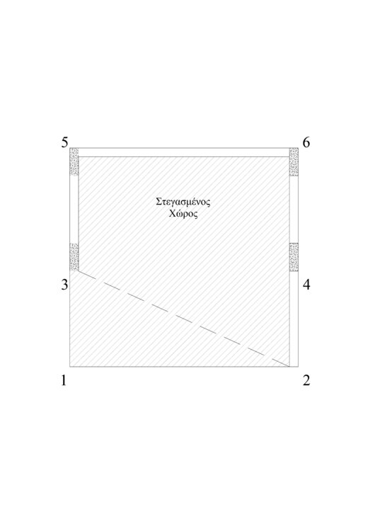 Συνάδελφοι, στο παρακάτω σχήμα, έχουμε ΑΗΧ; Η σύγκριση γίνεται ως: Α: 1,2,3 >= 35% x (1,3,5 + 5,6 + 6,4,2 + 2,1) ή Β: 2,3 >= 35% x (3,5 + 5,6 + 6,4,2 + 2,3) -----> όπως στο παράδειγμα 1 των τεχνικών οδηγιών ;;;; Έχω την αίσθηση ότι ισχύει το Α, καθώς στο παράδειγμα 1 των τεχνικών οδηγιών η κίτρινη επιφάνεια αντιστοιχεί στον στεγασμένο χώρο (?), ενώ στην περίπτωσή μας εδώ ο στεγασμένος χώρος δεν είναι η διαγώνιος 2,3 αλλά εκτείνεται στο 4,2,1,3 (άρα ορθογώνιο και όχι τρίγωνο)... επομένως, ποιά μετράμε σαν ανοιχτή πλευρά για να κάνουμε την σύγκριση; Όλη αυτή η διαφοροποίηση και ιδιάζουσα περίπτωση, από το γεγονός ότι στο σημείο 1 δεν έχουμε κολώνα (ή προέκταση τοίχου πλήρωσης από το σημείο 1 έως το 3 όπως συμβαίνει από το 3 έως το 2)... αν είχαμε κολώνα ή τοίχο πλήρωσης μέχρι εκεί, έχουμε την κοινή περίπτωση με ανοιχτή πλευρά την 1,2... Θα ήθελα την γνώμη σας...