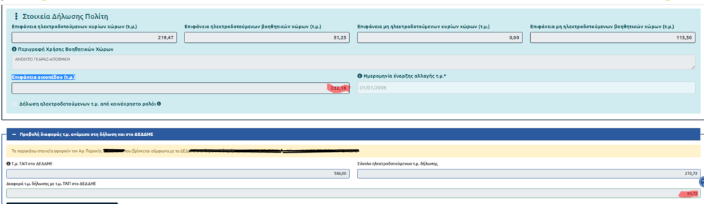 2. Καλησπερα σας, σε μονοκατοικια με ηλεκτροδοτουμενου και μη ηλεκτροδοτουμενους χωρους στο πεδιο "Διαφορά τ.μ. δήλωσης με τ.μ. ΤΑΠ στο ΔΕΔΔΗΕ" γιατι δεν προσθετει ολους τους χωρους αλλα μονο τους ηλεκτροδοτουμενους εφοσον ολοι οι χωροι παιρνουν ΤΑΠ? Επισης εφοσον ο ΣΔ εχει εξαντληθει θα πρεπει να διαγραψω το οικοπεδο απο το πεδιο "Επιφάνεια οικοπέδου (τ.μ.)"??