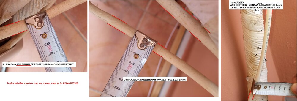 3. Πήγα να δω τη διατομή των καλωδίων που είπατε αλλά δεν μπόρεσα να δω αναγραφή προδιαγραφών, εκτός του 12αριου κλιματιστικού (3η φώτο) που ειναι και το πιο πρόσφατο και το καλώδιο του είναι και το πιο λεπτό. Το πιο χοντρό καλώδιο ειναι αυτό απο τον πίνακα στο 24αρι (1η φώτο) και ελαφρώς λεπτότερο αυτό που πάει στην εσωτερική μονάδα του (2η φώτο).