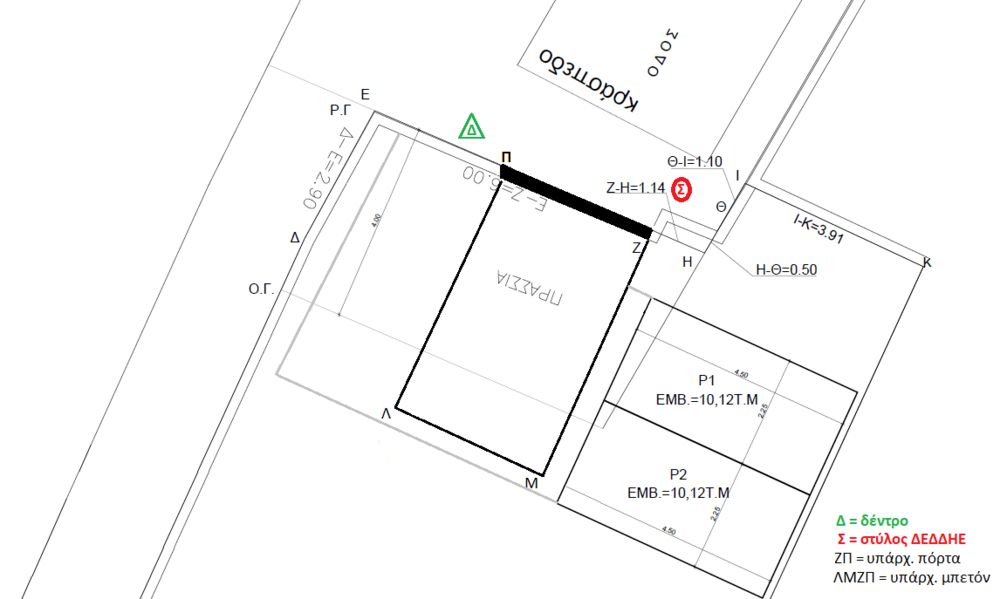 Επιπρόσθετα, ούτε ο στύλος ή το δέντρο απεικονίζονται κάπου άρα δεν έχω την επακριβή τους θέση με συντεταγμένες αλλά κατά προσέγγιση δηλαδή ο στύλος είναι προβολή του Ζ πίσω από τη μάντρα που κάνει σαν πι ενώ η πόρτα ξεκινάει από το Ζ (πλάτος 3μ) και 1 μ περίπου απέχει το δέντρο από το τέλος της (προς το Ε) όπως τα έχω τοποθετήσει στο αρχικό σχέδιο άνωθεν. Ορίστε η κάτοψη παρακάτω στις πραγματικές διαστάσεις (1:50) αν βοηθάει περισσότερο.