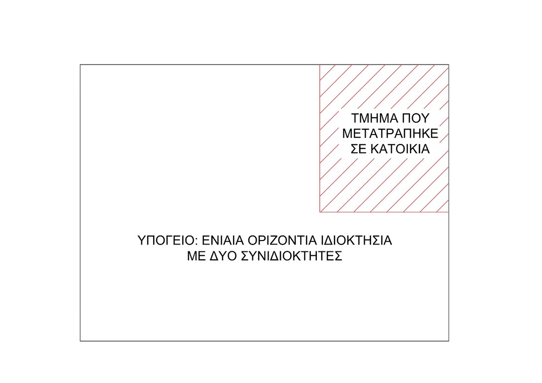 Επισυνάπτω ένα πολύ απλό σκαρίφημα: Έχουμε υπόγειο (κατά την σύσταση είναι ενιαία οριζόντια ιδιοκτησία), όπου τμήμα του μετατράπηκε αυθαίρετα σε κατοικία. Γίνεται μία δήλωση ρύθμισης για το υπόγειο, αφού αποτελεί μία ιδιοκτησία. Η ερώτησή μου είναι διαδικαστική για την έκδοση ΕΕΔΜΚ. Μόνο στο τμήμα του υπογείου που έγινε κατοικία ζητούνται μετά την ρύθμιση, τροποποιήσεις στα ανοίγματα, αλλαγή διαρρύθμισης κλπ. Μπορώ να ασχοληθώ αποκλειστικά με το τμήμα κατοικίας και να εκδώσω ΕΕΔΜΚ, χωρίς να μεσολαβήσει τροποποίηση σύστασης για να θεωρηθεί και αυτό το τμήμα οριζόντια; Ή πρέπει να εκδώσω ΕΕΔΜΚ αναφερόμενος σε όλο το υπόγειο, ασχέτως του ότι οι εργασίες αφορούν μόνο την κατοικία;
