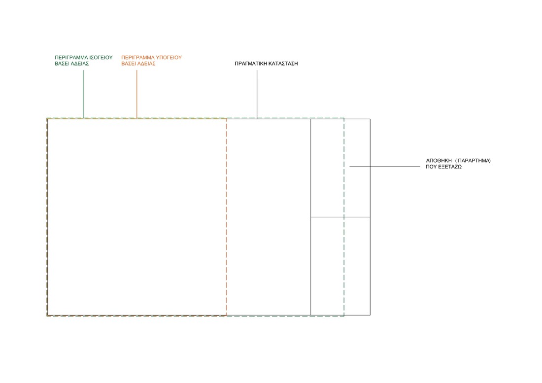 Είναι κάπως περίπλοκο και ελπίζω να βοηθάει το σκαρίφημα. Η υπόγεια αποθήκη, που είναι παράρτημα διαμερίσματος, βρίσκεται τελείως εκτός εγκεκριμένου περιγράμματος υπογείου. Ένα τμήμα της είναι εντός περιγράμματος ισογείου (υπέρβαση δόμησης) και ένα άλλο τμήμα της είναι εκτός περιγράμματος ισογείου (υπέρβαση δόμησης, κάλυψης και παραβίαση Δ). Προσπαθώ να δω αν μπορεί να αποφευχθεί η απαίτηση συναίνεσης και να προχωρήσει η υπαγωγή ως εκ κατασκευής και σε μη νόμιμη υπόγεια στάθμη.