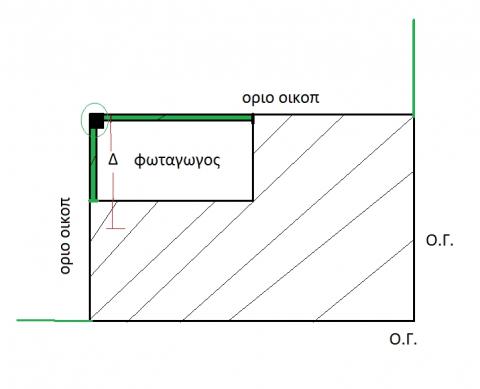 Στην παρακάτω περίπτωση , στα εγκεκριμένα υπάρχει το πράσινο τμήμα (δοκός-υποστύλωμα-δοκός) προκειμένου να ξεπεραστεί το πρόβλημα του Δ , καθώς το κτίριο θεωρήθηκε κολλημένο στο όριο Δ=0 με φωταγωγό. Στην κατασκευή το πράσινο τμήμα δεν έγινε ποτέ. Με δεδομένο ότι τμήμα που ΔΕΝ κατασκευάστηκε δεν επισύρει πρόστιμο , και αφού δεν υπάρχει ούτε αλλαγή θέσης κτιρίου ούτε υπέρβαση δόμησης , πως πρέπει να αντιμετωπιστεί αυτή η περίπτωση ?