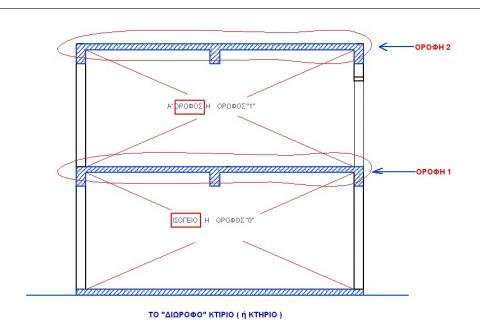 "όροφος αρσενικό χώρος οικοδομής ανάμεσα σε δύο οροφές που αποτελείται από ένα ή περισσότερα διαμερίσματα που βρίσκονται στο ίδιο επίπεδο (ο όρος δεν εφαρμόζεται στο υπόγειο, το ισόγειο, ή τον ημιώροφο)" Θυμόμαστε πάντα ότι άλλο πράγμα είναι η "οροφή" και άλλο πράγμα είναι ο "όροφος". Πάμε τώρα. Ας αναλύσουμε λίγο το "διώροφο" κτίριο : Εννοούμε την οικοδομή που έχει 2 οροφές. (Το ισόγειο κτίριο κανονικά λέγεται μονώροφο) Ας θυμηθούμε την ονομασία των σχεδίων των στατικών :"Ξυλότυπος Οροφής Ισογείου" , "Ξυλότυπος οροφής Α' ορόφου" και ΠΟΤΕ δεν υπήρξε μπέρδεμα σε αυτό. Το δάπεδο επί του εδάφους δεν είναι οροφή για αυτό και δεν θεωρείται "όροφος" κατά τον ορισμό. ΑΡΑ σε κάθε περίπτωση 1ος όροφος ή Α' όροφος ορίζεται το τμήμα μεταξύ της οροφής ισογείου και της επόμενης οροφής . Αυτό μας αφήνει τις εξής 2 επιλογές για το τμήμα μεταξύ εδάφους και πρώτης οροφής : ΙΣΟΓΕΙΟ ή ΟΡΟΦΟΣ 0. Στις σύνθετες περιπτώσεις οικοπέδων με κλίση και περισσότερα του ενός πρόσωπα σε οδούς : Οπως στα σχέδια της πολεοδομίας γράφουμε ότι "αφετηρία για την μέτρηση των υψομέτρων λαμβάνετια το τάδε " , έτσι και στην σύσταση, μπορούμε να πούμε κάτι σε στυλ "για την σύνταξη του παρόντος ως ισόγειο και αφετηρία μέτρησης των ορόφων ορίζεται το τμήμα επί της οδού Α" το οποίο θα πρέπει να είναι και η χαμηλότερη στάθμη που μετράει στον ΣΔ. -