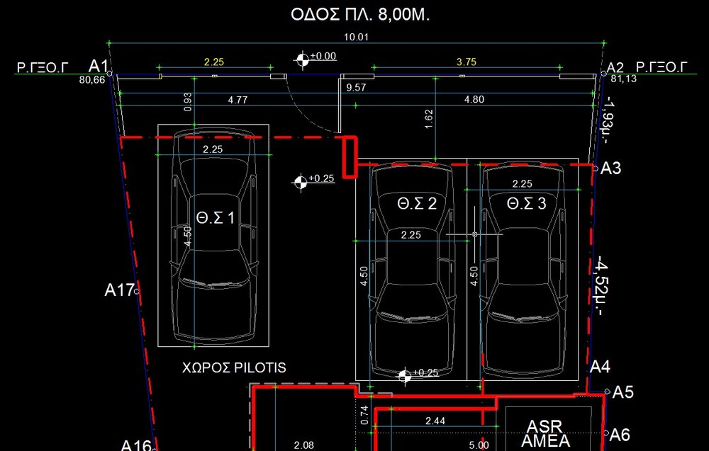Καλημέρα συνάδελφοι!! Ανεβάζω εδώ την απορία μου καθώς έχω δει σχετικές αναρτήσεις στις προηγούμενες σελίδες και περιμένω τη γνώμη σας... Έχω pilotis σε οικόπεδο που έχει πρόσοψη πλάτους 10,00μ. Δεν έχω πρασιά, καθώς η Ο.Γ. ταυτίζεται με την Ρ.Γ. Συνολικά έχω 3 διαμερίσματα στο κτίριο αυτό, άρα απαιτούνται 3 θέσεις στάθμευσης. Το οικόπεδο είναι ιδιαιτέρως δύσκολο (έντονα παράγωνο, με πολλά σπασίματα) και στην εικόνα που σας παραθέτω η κόκκινη διακεκομμένη γραμμή είναι το περίγραμμα της pilotis. Στο κάτω μέρος της φωτογραφίας με κόκκινη συνεχόμενη γραμμή είναι το κεντρικό κλιμακοστάσιο της πολυκατοικίας. Το ερώτημα μου έγκειται στο αν μπορώ να τοποθετήσω τις θέσεις στάθμευσης όπως σας τις έχω σχεδιάσει: μία αριστερά με δική της είσοδο/έξοδο πλάτους 2,25μ. και οι άλλες δύο δεξιά με κοινή είσοδο/έξοδο πλάτους 3,75μ. Οι αποστάσεις μέχρι την μάντρα διακρίνονται για την κάθε μία στην εικόνα. Και οι 3 θέσεις θα πρέπει να βγαίνουν με την όπισθεν... Είναι δόκιμος ο τρόπος που έχουν τοποθετηθεί??? Ιδιαίτερα οι ΘΣ 2 και 3... Πολεοδομικά θα έχω θέμα? Να προσθέσω τα εξής στοιχεία: 1. Σύμφωνα με το αρ. 10 του ΦΕΚ 76/2004, δεν μπορώ να μεγαλώσω άλλο τα ανοίγματα των γκαραζοπορτων καθώς με τον έλεγχο των εισόδων/εξόδων είμαι στα 6,00μ. ακριβώς (καθώς έχω πρόσωπο 10,00μ. / 2 = 5,00μ. < 6,00μ. = max πλάτος ανοιγμάτων σε πρόσοψη). 2. Οι απαιτήσεις σε φύτευση είναι εξασφαλισμένες. 3. Οι Θ.Σ. 2&3 θα ανήκουν στον ίδιο ιδιοκτήτη, αλλά για δύο διαφορετικά διαμερίσματα που έχει... Σας ευχαριστώ εκ των προτέρων!!!!!!!