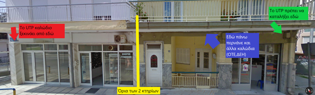 Τα κτήρια μας είναι δίπλα-δίπλα οπότε δεν υπάρχει άλλος τρόπος διέλευσης του καλωδίου. Εχώ ανεβάσει και μια φωτογραφία, στην οποία φαίνονται πιο ξεκάθαρα οι συνθήκες.