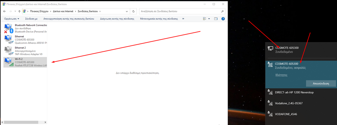 Στη 1φ φαίνεται το LAN κανονικά σε σύνδεση και το wifi αμέσως από κάτω Cosmote σε αποσύνδεση.