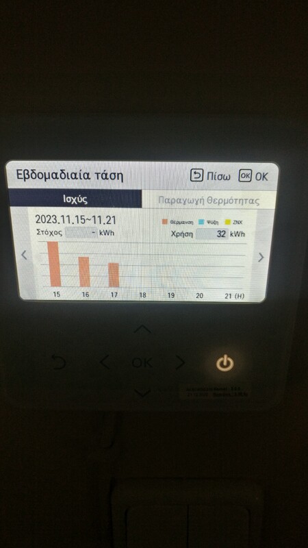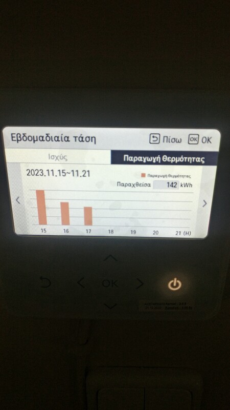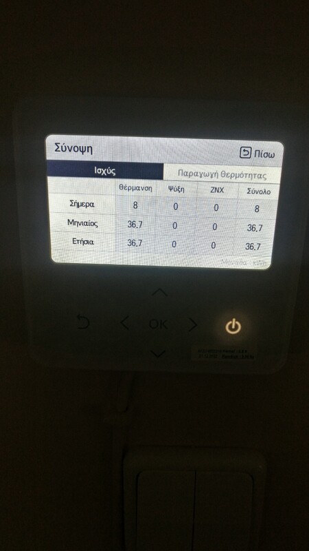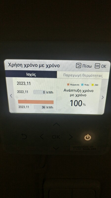 Αντλία θερμότητας: κατανάλωση και άλλα συγκριτικά στοιχείαGantem replied to Stiv79's θέμα in Θέματα Ιδιωτών Οι ενδείξεις είναι από το χειριστήριο της lg... μάλλον είναι ανάλογα το firmware...εγώ έχω το 3066 και μου τα δείχνει...εγώ στο 60% απόδοση και ινβερταρει... δοκιμάστε να βάλετε τα νερά υστέρησης στο -2+4... Εμένα από την μέρα που τα έβαλα δεν κάνει start stop και παίζει με 0,4 και 0,5 kw με συνεχόμενη λειτουργία και καταναλώσεις γύρο στις 12με15 την μέρα