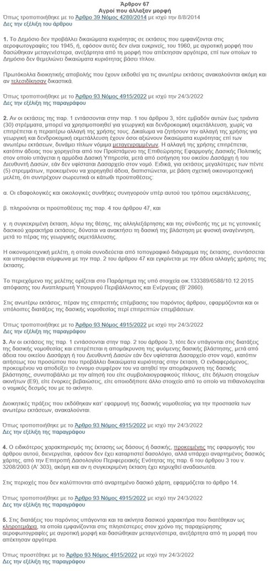 Έπειτα βγήκε απόφαση αναφορικά με τα τμήματα Γ και Δ τα οποία εντάχθηκαν στο άρθρου 67, του Ν. 998/79 (δλδ χαρακτηρίστηκαν ως "Αγροί που άλλαξαν μορφή"). (Δεν τα έχω πρόχειρα, αλλά μήπως είναι αυτά με τις χορτολιβαδικές κλπ;) βλ εικόνα Κατόπιν τούτου έγινε διόρθωση συμβολαίου και εξαιρέθηκαν από την μεταβίβαση τα τμήματα Α και Β. (εξήγησε τι ακριβώς εννοείς γράφοντας ότι "εξαιρέθηκαν". Έτσι και αλλιώς δεν είχαν μπει στο συμβόλαιο λόγω του δασικού χαρακτήρα τους). Στο πρώτο συμβόλαιο είχαν μπει, μετά πήγαν Υποθηκοφυλακείο και η υποθηκοφύλακας αρνήθηκε να το μεταγράψει. Οπότε έγινε διόρθωση του συμβολαίου χωρίς όμως να μεταβιβάζονται τα τμήματα ΔΔ και ΔΑ(δλδ τα τμήματα Α και Γ). Το ακίνητο είναι στην Κρήτη και ίσως ισχύει κάτι διαφορετικό με την υπόλοιπη Ελλάδα. 19η) Για ποιες περιοχές της χώρας δεν ισχύει το τεκμήριο κυριότητας υπέρ του Δημοσίου και το βάρος της απόδειξης της ιδιοκτησίας το έχουν εξίσου οι πολίτες και το Δημόσιο;Οι περιοχές όπου δεν ισχύει το τεκμήριο κυριότητας υπέρ του Δημοσίου ( ν.4821/21) είναι η Κρήτη, τα Δωδεκάνησα, οι Κυκλάδες, η Μάνη και το Βόρειο Αιγαίο (Λέσβος, Σάμος, Χίος).--(Έχοντας καιρό να ασχοληθώ με τα δασικά, εκφράζω μια γνώμη μήπως το τεκμήριο της κυριότητας υπέρ του ιδιοκτήτη, ναι μεν υφίσταται, αλλά μηπως αυτό θα πρέπει με κάποια διαδικασία αίτησης στην δ/νση δασών του Νομού να περάσει στο δασικό χάρτη και τον κυρωμένο δασικό χάρτη ώστε να αλλάξει ο χαρακτηρισμός ΑΔ; Αλλιώς πως θα μπορέσεις να υπογράψεις την Υ.Δ ότι "δεν εμπίπτει στις προστατευτικές διατάξεις της δασικής νομοθεσίας"; Και εγώ πιστεύω πως αυτό πρέπει να γίνει και φοβάμαι ότι θα υπάρχει αναμονή..... Η αίτηση έχει γίνει και η τα τμήματα έχουν χαρακτηριστεί ως δασωμένη αγροί και επίσης στην απόφαση του δασαρχείου αναφέρει ότι "Επιτρέπουμε την απομάκρυνση της φυόμενης δασικής βλαστήσεως στην ανωτέρω έκταση" Έπειτα βγήκε απόφαση αναφορικά με τα τμήματα Γ και Δ τα οποία εντάχθηκαν στο άρθρου 67, του Ν. 998/79 (δλδ χαρακτηρίστηκαν ως "Αγροί που άλλαξαν μορφή"). (Δεν τα έχω πρόχειρα, αλλά μήπως είναι αυτά με τις χορτολιβαδικές κλπ;) βλ εικόνα Κατόπιν τούτου έγινε διόρθωση συμβολαίου και εξαιρέθηκαν από την μεταβίβαση τα τμήματα Α και Β. (εξήγησε τι ακριβώς εννοείς γράφοντας ότι "εξαιρέθηκαν". Έτσι και αλλιώς δεν είχαν μπει στο συμβόλαιο λόγω του δασικού χαρακτήρα τους). Στο πρώτο συμβόλαιο είχαν μπει, μετά πήγαν Υποθηκοφυλακείο και η υποθηκοφύλακας αρνήθηκε να το μεταγράψει. Οπότε έγινε διόρθωση του συμβολαίου χωρίς όμως να μεταβιβάζονται τα τμήματα ΔΔ και ΔΑ(δλδ τα τμήματα Α και Γ). Το ακίνητο είναι στην Κρήτη και ίσως ισχύει κάτι διαφορετικό με την υπόλοιπη Ελλάδα. 19η) Για ποιες περιοχές της χώρας δεν ισχύει το τεκμήριο κυριότητας υπέρ του Δημοσίου και το βάρος της απόδειξης της ιδιοκτησίας το έχουν εξίσου οι πολίτες και το Δημόσιο;Οι περιοχές όπου δεν ισχύει το τεκμήριο κυριότητας υπέρ του Δημοσίου ( ν.4821/21) είναι η Κρήτη, τα Δωδεκάνησα, οι Κυκλάδες, η Μάνη και το Βόρειο Αιγαίο (Λέσβος, Σάμος, Χίος).--(Έχοντας καιρό να ασχοληθώ με τα δασικά, εκφράζω μια γνώμη μήπως το τεκμήριο της κυριότητας υπέρ του ιδιοκτήτη, ναι μεν υφίσταται, αλλά μηπως αυτό θα πρέπει με κάποια διαδικασία αίτησης στην δ/νση δασών του Νομού να περάσει στο δασικό χάρτη και τον κυρωμένο δασικό χάρτη ώστε να αλλάξει ο χαρακτηρισμός ΑΔ; Αλλιώς πως θα μπορέσεις να υπογράψεις την Υ.Δ ότι "δεν εμπίπτει στις προστ