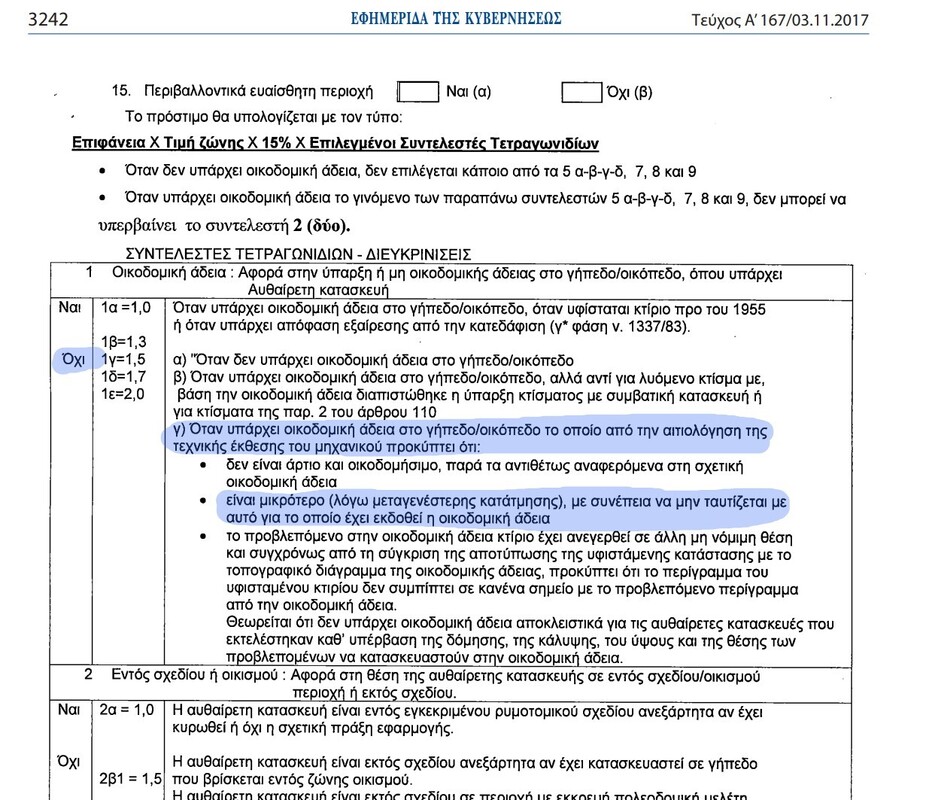 @Pavlos33 Έχω μία παρόμοια περίπτωση και έχω απορία σε ποια κατηγορία κατατάσσεται αυτή η αυθαίρετη κατασκευή; Τμήμα κοινόχρηστης πυλωτής έχει κλειστεί και έχει γίνει κατοικία. Είναι κατηγορία 4 ή 5; Αν θεωρήσεις ότι δεν έχει χιλιοστά τότε όπως λες η ΥΔ τείνει στο άπειρο. Άρα κατηγορία 5; Το ίδιο προφανώς θα ισχύει για οποιαδήποτε δήλωση αφορά κοινόχρηστους χώρους και έχει έστω και 1 τ.μ. υπέρβαση που αποτελεί αυτοτελή χρήση ανεξάρτητη και ανήκει σε όλους τους ιδιοκτήτες κατ' αναλογία των χιλιοστών τους.