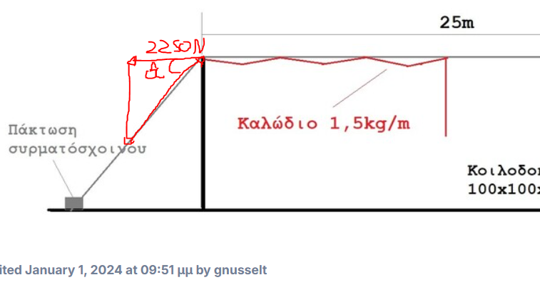 S = (w*L2) / (8*T) Όπου: w το φορτίο ανά μέτρο (συρματόσχοινο + καλώδιο), L το άνοιγμα, T η τάση του νήματος. Τη διατομή του συρματόσχοινου τη βρίσκεις από την απαιτούμενη τάση του νήματος. Έστω συρματόσχοινο Φ8 (≈ 0,25 kg/m, Tmax ≈ 30 kN, Tsafe = 10 kN). Το προφορτίζω με 5 kN. Το βάρος του, μαζί με το καλώδιο, είναι: 17,5 N/m × 25 m = 438 N. Συνολικά, θα “δει” περίπου 5,5 kN, δηλαδή αμελητέο σε σχέση με τα όρια. Άρα: S = (17.5 * 252) / (8*5000) = 0.27m Δηλαδή 27 cm βέλος. Πάμε τώρα να δούμε τις αντιδράσεις. Με ανάλυση δυνάμεων: cos(a) = 2250 / T_αντίδρασης άρα: T_αντίδρασης = 2250 / cos(a) Αν α = 45° → T_αντίδρασης = 2250 / cos(45°) ≈ 3181 N (παραμένει εντός των προδιαγραφών για Φ8)