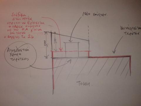 Η αποκλειστική χρηση περιγραφεται στο συμβόλαιο και μεταβιβάζεται. Η σταθμη του δαπέδου της ταρατσας κατεβηκε 1 μ, για να μπορει ο χωρος της σοφιτας να αυλίζεται. (απο κάτω στα σχεδια της ΟΑ, το ύψος του διαμερίσματος στο οποίο ανηκει η σοφίτα ήταν 4 μ και υλοποιήθηκε 3 μ) βλ. σκιτσο. Τι εννοεί ο ποιητης : προκειμένου να ελεγχθεί η τήρηση των προϋποθέσεων της Κατηγορίας 4 συνυπολογίζονται στην επιφάνεια των υπολοίπων αυθαιρέτων κατασκευών ? Το εξέλαβα ως : συνυπολογίζονται στην επιφάνεια των λοίπων αυθαιρέτων κατασκευών της κατηγορίας 13... (μακακια αφού δεν εχουν επιφανεια)
