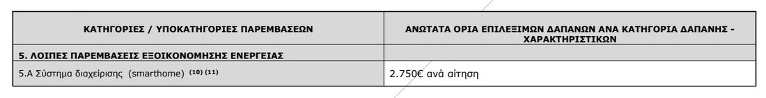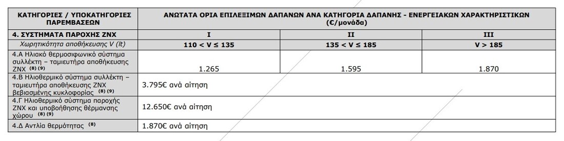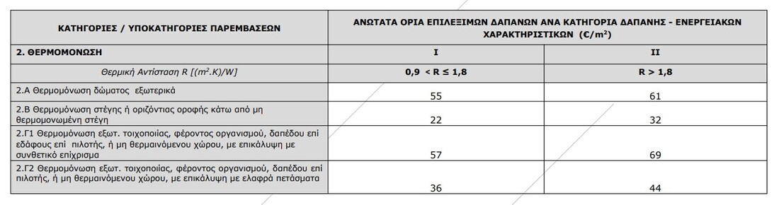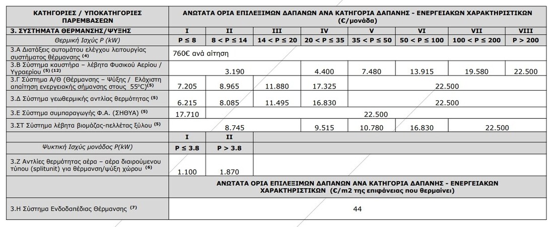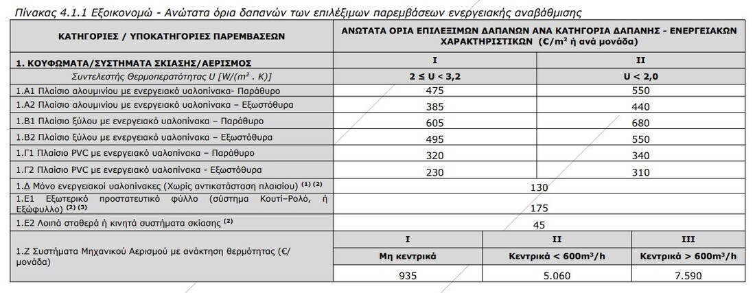 Τα ανώτατα όρια επιλέξιμων δαπανών για τις κατηγορίες επιλέξιμων παρεμβάσεων ενεργειακής αναβάθμισης και τις υποκατηγορίες τους, που αναλύθηκαν στο προηγούμενο κεφάλαιο, αναγράφονται στον πίνακα 4.1.1 και παρουσιάζονται, ανά κατηγορία δαπάνης βάσει των ενεργειακών τους χαρακτηριστικών. ΚΟΥΦΩΜΑΤΑ/ΣΥΣΤΗΜΑΤΑ ΣΚΙΑΣΗΣ/ΑΕΡΙΣΜΟΣ Περιορισμοί: 1. Αφορά επιλέξιμες κατοικίες/διαμερίσματα προστατευόμενα ως μέρος συγκεκριμένου περιβάλλοντος ή λόγω της ιδιαίτερης αρχιτεκτονικής ή ιστορικής τους αξίας, όπως διατηρητέα και εντός παραδοσιακών οικισμών κτήρια, στο βαθμό που η συμμόρφωση προς ορισμένες ελάχιστες απαιτήσεις ενεργειακής απόδοσης θα αλλοίωνε κατά τρόπο μη αποδεκτό το χαρακτήρα ή την εμφάνισή τους. Στην περίπτωση αυτή, ο Ενεργειακός Επιθεωρητής θα πρέπει στο Έντυπο Καταγραφής παρεμβάσεων (Παρ. VI) να δηλώνει το συνολικό U του κουφώματος που επιτεύχθηκε με τον υαλοπίνακα που τοποθετήθηκε. 2. Ανώτατο όριο δαπάνης ανεξαρτήτως συντελεστή θερμοπερατότητας U. Για την καταχώρηση στον πίνακα παρεμβάσεων επιλέγεται κατηγορία U I. 3. Συμπληρωματικές παρεμβάσεις (επιλογή υποχρεωτικά σε συνδυασμό με αντικατάσταση κουφωμάτων). ΘΕΡΜΟΜΟΝΩΣΗ ΣΥΣΤΗΜΑΤΑ ΘΕΡΜΑΝΣΗΣ/ΨΥΞΗΣ Περιορισμοί: 4. Ανώτατο όριο δαπάνης ανεξαρτήτως ισχύος. Για την καταχώρηση στον πίνακα παρεμβάσεων επιλέγεται κατηγορία ισχύος I. 5. Η επιλέξιμη δαπάνη αφορά μόνο ένα σύστημα θέρμανσης και όχι περισσότερα των υποκατηγοριών 3.Β έως 3.ΣΤ. 6. Με μέγιστο την τοποθέτηση 3 εξωτερικών μονάδων. 7. Επιλέξιμη παρέμβαση μόνον όταν περιλαμβάνονται στην πρόταση αναβάθμισης η παρέμβαση εξοικονόμησης ενέργειας της κατηγορίας 3Γ ή 3Δ. 12. Επιλέξιμη παρέμβαση μόνο ως αντικατάσταση υφιστάμενου συστήματος θέρμανσης (συμβατικών υγρών ή στερεών καυσίμων). Ο Ενεργειακός Επιθεωρητής καταγράφει στην πρόταση παρεμβάσεων (Παράρτημα II), το είδος καυσίμου του υφιστάμενου συστήματος θέρμανσης. ΠΑΡΟΧΗ ΖΝΧ Περιορισμοί: 8. Η επιλέξιμη δαπάνη αφορά μόνο ένα σύστημα παροχής ΖΝΧ και όχι περισσότερα των υποκατηγοριών 4.Α έως 4.Δ. 9. Για όσες επιλέξιμες κατοικίες δεν υπάρχει ήδη εγκατεστημένο σύστημα ΖΝΧ με χρήση ΑΠΕ, είναι υποχρεωτική η εγκατάσταση ηλιακού συστήματος για την παροχή ΖΝΧ, εκτός εάν αυτό δεν είναι εφικτό και υπάρχει σχετική τεκμηρίωση του Ενεργειακού Επιθεωρητή. Σημείωση: Σε περίπτωση που στο σύστημα θέρμανσης περιλαμβάνεται και η παροχή ζεστού νερού χρήσης (ΖΝΧ) και ο ταμιευτήρας αποθήκευσης του ΖΝΧ είναι ενσωματωμένος στο σύστημα θέρμανσης, δεν είναι επιλέξιμες οι παρεμβάσεις 4.Α, 4.Γ, 4.Δ, ενώ γίνεται απομείωση της τιμής στην 4.Β, κατά το ποσό που αναφέρεται στον Οδηγό. ΛΟΙΠΕΣ ΠΑΡΕΜΒΑΣΕΙΣ ΕΞΟΙΚΟΝΟΜΗΣΗΣ ΕΝΕΡΓΕΙΑΣ Περιορισμοί: 10. Επιλέξιμη παρέμβαση μόνον όταν περιλαμβάνονται στην πρόταση αναβάθμισης και παρεμβάσεις εξοικονόμησης ενέργειας των κατηγοριών 1 έως 4. 0 Ενεργειακός Επιθεωρητής πρέπει να δηλώσει την εκτιμώμενη εξοικονόμηση ενέργειας που επιτυγχάνεται από την υλοποίηση της παρέμβασης. 11. Έξυπνα συστήματα διαχείρισης του συστήματος θέρμανσης που τοποθετούνται στα πλαίσια της παρούσας παρέμβασης, δεν μπορούν να είναι ταυτόχρονα επιλέξιμα και στην υποκατηγορία 3.Α. *** Για αντικατάσταση ή νέα εγκατάσταση συστημάτων θέρμανσης σε κτήριο / κτηριακή μονάδα η προτεινόμενη μέγιστη θερμική ισχύς του συστήματος (kW), βάσει του δελτίου προϊόντος του συστήματος, δεν μπορεί να βρίσκεται σε ανώτερη κατηγ