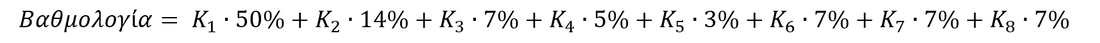 Τα κριτήρια καθώς και ο αντίστοιχος συντελεστής βαρύτητάς τους αναγράφονται στον ακόλουθο πίνακα. Α/Α Κριτήριο Βαρύτητα Συντελεστών Ανώτατο βαθμολογούμενο όριο κριτηρίου Κατώτατο βαθμολογούμενο όριο κριτηρίου K1 Ανηγμένο κόστος εξοικονόμησης ενέργειας 50% 0,200 1,100 K2 Εισόδημα (€)/μέλος οικογένειας 14% 1.000(€)/άτομο οικογένειας 30.000(€)/άτομο οικογένειας K3 Βαθμοημέρες 7% 1,4069 0,2180 K4 Ενεργειακή κλάση. βάσει Α’ ΠΕΑ 5% Η Γ K5 Παλαιότητα κατασκευής 3% Προ του 1955 2011 K6 ΑμεΑ 7% σταθερό K7 Μονογονεϊκή Οικογένεια 7% σταθερό K8 Πολύτεκνοι 7% σταθερό Μέγιστο ποσοστό βαρύτητας συντελεστών 100% Η εξίσωση υπολογισμού βαθμολογίας από τον οποίο θα προκύπτει η Σειρά Κατάταξης βάσει και των ανωτέρω κριτηρίων είναι η εξής: Τα κριτήρια θα λαμβάνουν κανονικοποιημένη τιμή βάσει προκαθορισμένων ακρότατων τιμών. Αναλυτικά τα κριτήρια παρουσιάζονται στο Παράρτημα IX. Επισημαίνεται ότι η διαδικασία της Συγκριτικής Αξιολόγησης των αιτήσεων θα είναι ξεχωριστή για δύο (2) κατηγορίες Ωφελούμενων και για κάθε Περιφέρεια. - Κατηγορία 1η: Αιτήσεις όπου ο Ωφελούμενος βρίσκεται στην πρώτη (1η) εισοδηματική κατηγορία (βλ. πίνακα 2.2.1) - Κατηγορία 2η: Αιτήσεις όπου ο Ωφελούμενος βρίσκεται στις λοιπές εισοδηματικές κατηγορίες Ισοβαθμίες Στις περιπτώσεις ισοβαθμίας αιτήσεων στην συνολική τους βαθμολογία, η σειρά στους πίνακες κατάταξης (αρχικούς, προσωρινούς, οριστικούς) θα γίνεται βάσει της μεταξύ τους σύγκρισης στην επιμέρους βαθμολογία των κριτηρίων (με σειρά προτεραιότητας): Κ1, Κ2, Κ3. Βοηθητική εφαρμογή υπολογισμού αρχικής βαθμολογίας αίτησης