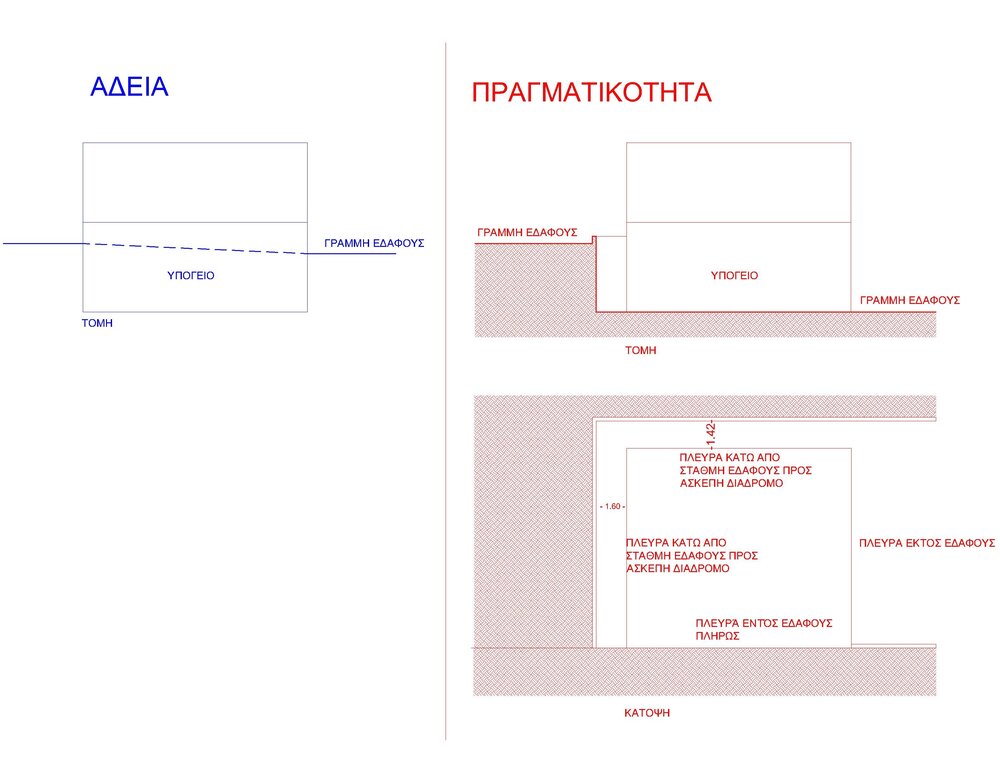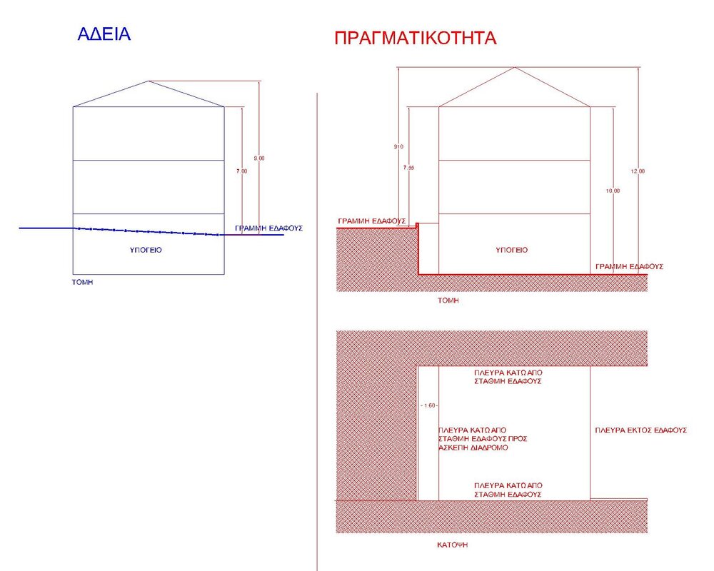 Γεια σου Παύλο και σε ευχαριστώ θερμά για την απάντηση. Αυτές οι γνώμες είναι που με προβληματίζουν γιατί όπως όλοι αντιλαμβανόμαστε είμαστε στη δύσκολη θέση να παίρνουμε αποφάσεις (που σημαίνουν πολλά ευρώ) για τις οποίες δεν έχουμε λάβει ποτέ μια σαφή και ασφαλή οδηγία για το πως θα πρέπει να χειριζόμαστε ανάλογες υποθέσεις. Λόγω του ξεμπαζώματος στο εμπρός τμήμα έχω ύψος μαζί με τη στέγη 12 μ ενώ το μέγιστο επιτρεπόμενο είναι 7.50 + 2.00 = 9.50. Στο πίσω μέρος (αν δεν λάβω υπόψιν το ιδιότυπο κουραγκλέ έχω 9.10 μ. Στέλνω ένα ενημερωμένο σκαρίφημα. Στο προηγούμενο επικεντρώθηκα στο υπόγειο αλλά καλύτερα δείχνω συνολικά τα μεγέθη στο νέο. Αν βάλω το χώρο ως ΚΧ τότε έχω πρόστιμο 8.000, αν το βάλω με μειωτικό 4.000 περίπου. Η διαφορά είναι δραματική.