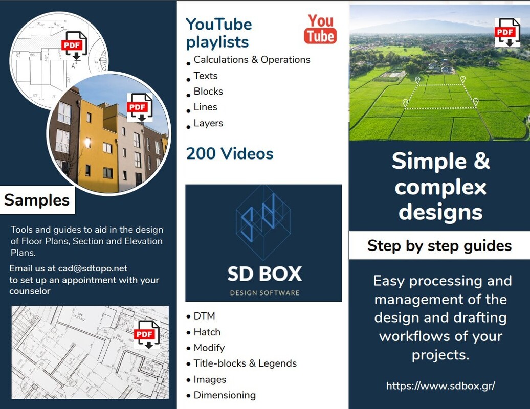 Όλες οι ενδείξεις του SDBOX εισάγονται στο σχέδιο στα κατάλληλα layer και με αυτόματο μέγεθος ανάλογα με την κλίμακα εκτύπωσης. Website facebook Page facebook Group Videos Instagram TikTok Οδηγός Χρήσης Download trial