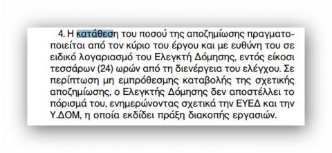 Από τις ερωτοαπαντήσεις του ΥΠΕΚΑ 1.Πώς γίνεται η αποζηµίωση του Ελεγκτή ∆όµησης ? Ο κύριος του έργου καταθέτει το ποσό της αποζηµίωσης στο λογαριασµό όψεως του Ελεγκτή ∆όµησης, στην Εθνική Τράπεζας Ελλάδας. 4. Πως ενηµερώνεται ο κύριος του έργου για την κατάθεση της αποζηµίωσης? Κατά τη διενέργεια της αυτοψίας ο Ελεγκτής ∆όµησης ενηµερώνει τον κύριο του έργου για το ποσό της αποζηµίωσης και τον λογαριασµό όψεώς του στην Εθνική Τράπεζας Ελλάδας. Τι πιο ξεκάθαρο από τα παρακάτω (επικουρικά στα παραπάνω) (ερωτοαπαντήσεις του ΥΠΕΚΑ) ???!!!!! 2. Πότε πρέπει να κατατεθεί η αποζηµίωση? Εντός 24 ωρών από τη διενέργεια επιτόπιου ελέγχου από τον Ελεγκτή ∆όµησης (δηλαδή την ίδια ή την επόµενη εργάσιµη ηµέρα) πρέπει να γίνει η κατάθεση του ποσού της αποζηµίωσης από τον κύριο του έργου. 3. Το πόρισµα αποστέλλεται πριν ή µετά την κατάθεση της αποζηµίωσης? Εφόσον η κατάθεση γίνει εγκαίρως αποστέλλετε το πόρισµα (θετικό ή αρνητικό) στην οικεία Υ∆ΟΜ και στην ΕΥΕ∆. ∆ιαφορετικά ενηµερώνετε την ΕΥΕ∆ και την οικεία Υ∆ΟΜ, η οποία οφείλει να προβεί σε πράξη διακοπής των εργασιών. Με λίγα λόγια πρέπει να έχεις εξασφαλίσει ότι θα γίνει η κατάθεση στα πλαίσια που ορίζει ο νόμος (αυτή η διαδικασία σε προφυλάσσει) αλλιώς .... τα παραπάνω.