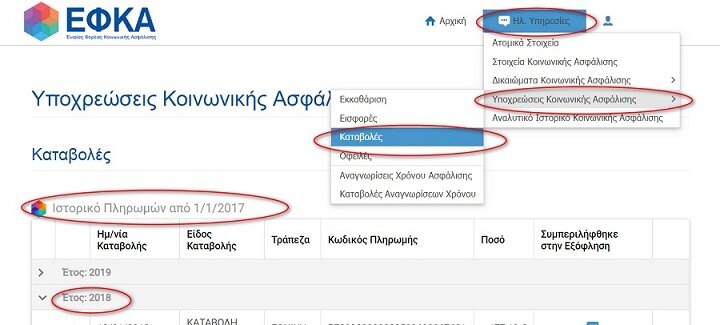 @Faethon11, τις καλημέρες μου, Να κάνω μια προσπάθεια μήπως και βοηθήσω στο θέμα. 1) Το σκεπτικό σου είναι σωστό εφόσον βέβαια τα 200€ που αναφέρεις τα εξέπεσες στην φορολογική δήλωση του 2017, δηλ. στην ΦΒ του 2017. 2) Πρακτικά σύμφωνα με την ΠΟΛ.1219/2018: "4. Από τα ανωτέρω προκύπτει ότι οι ασφαλιστικές εισφορές (κύριας, επικουρικής ασφάλισης και πρόνοιας) εκπίπτουν από τα ακαθάριστα έσοδα της επιχείρησης υπό τις προϋποθέσεις του άρθρου 22 εφόσον καταβληθούν, δηλαδή κατά τον χρόνο που επιβαρύνουν ταμειακά την επιχείρηση. Ως εκ τούτου, οποιοδήποτε ποσό καταβάλλεται ταμειακά ως ασφαλιστική εισφορά από 1.1 μέχρι 31.12 του τρέχοντος φορολογικού έτους, εκτός από τα ποσά προσαυξήσεων, προστίμων, κλπ. που τυχόν καταβλήθηκαν στο έτος αυτό, εκπίπτει από τα ακαθάριστα έσοδα της επιχείρησης του έτους αυτού." με ιδιαίτερη προσοχή/συνδυαστικά με το παρακάτω της ίδιας ΠΟΛ "7. Ειδικά, στις περιπτώσεις που νομικά πρόσωπα, νομικές οντότητες ή φυσικά πρόσωπα που αποκτούν εισόδημα από επιχειρηματική δραστηριότητα, συμπεριέλαβαν τις καταβληθείσες εισφορές του έτους 2018 οι οποίες αφορούσαν το προηγούμενο έτος, στα φορολογικά αποτελέσματα του έτους 2017, δεν απαιτείται να υποβάλουν τροποποιητικές δηλώσεις φορολογίας εισοδήματος για το φορολογικό έτος 2017. Επισημαίνεται, όμως, ότι για τα ποσά αυτά δεν θα εφαρμοσθούν τα αναφερόμενα στην προηγούμενη παράγραφο της παρούσας και επομένως δεν θα ληφθούν υπόψη στη δήλωση φορολογικού έτους 2018, καθόσον διαφορετικά θα προέκυπτε θέμα διπλής έκπτωσης της ασφαλιστικής δαπάνης." 3) Εικάζω λοιπόν, ότι τα 120€ που αναφέρεις έχουν να κάνουν με την εκκαθάριση των εισφορών του 2017 (που λάβαμε κάπου το Μάιο του 2018) και είχες χρεωστικό. Και, είτε ως συνολικό ποσό με μία πληρωμή, είτε ως κάποιες δόσεις καταβλήθηκαν εμπρόθεσμα στο 2018, και εξέπεσαν στην ΦΒ του 2017 σύμφωνα με την τότε ισχύουσα ΠΟΛ.1113/2015. Οπότε αν το ποσό αυτό είτε ως όλο είτε ως μέρος το εξέπεσες στην ΦΒ του 2017 δεν θα πρέπει να το εκπέσεις (και) στην ΦΒ του 2018. (σύμφωνα και με την παραπάνω παράγραφο 7, της ΠΟΛ 1219/2018). 4) Πήγαινε στον λογαριασμό σου στο ΕΦΚΑ όπως παρακάτω στο σχήμα και δες τι ποσά από αυτά που αναγράφει εκεί (στο 2018) έχεις εκπέσει με την φορολογική δήλωση του 2017, δηλ. στην ΦΒ του 2017. Λογικά ο πίνακας αυτός πρέπει να σου εμφανίζει αν είσαι "τακτικός" πελάτης τα ποσά που κατέβαλες από 1/1-31/12/2018: α) των μηνών ΔΕΚ'17 β) από και τον ΙΑΝ'18 έως και τον ΝΟΕ'18 γ) είτε ως σύνολο αν είχες κάνει μία πληρωμή, είτε ως δόσεις που έχουν σχέση με την εκκαθάριση του 2017 (που λάβαμε κάπου το Μάιο του 2018) Οπότε αν τα (α') και (γ') τα εξέπεσες (σύμφωνα με την τότε ισχύουσα ΠΟΛ.1113/2015) στην ΦΒ του 2017 δεν θα εκπέσουν στην ΦΒ του 2018. Άρα λογικά τα 120€ (μάλλον) είναι το (γ') και εφόσον το εξέπεσες στην ΦΒ του 2017, δεν θα το εκπέσεις στην ΦΒ του 2018. Αν υπάρχει διάθεση και όρεξη επιβεβαίωσε ή διέψευσε το σκεπτικό μου.
